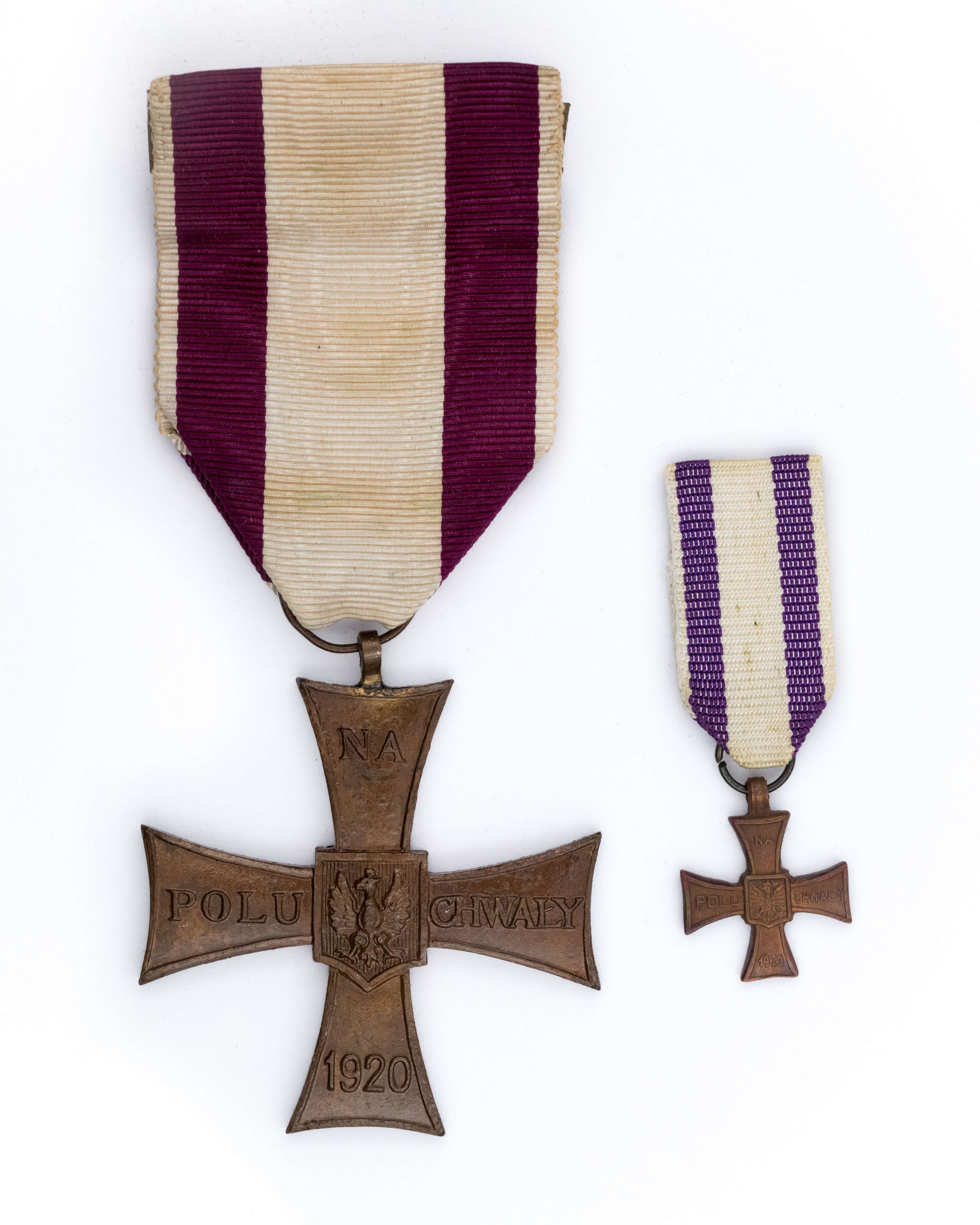 Krzyż Walecznych 1920. 42 x 42mm, miniatura 15 x 15mm, brąz, stan bardzo dobry - zachowane oryginalne wstążki.