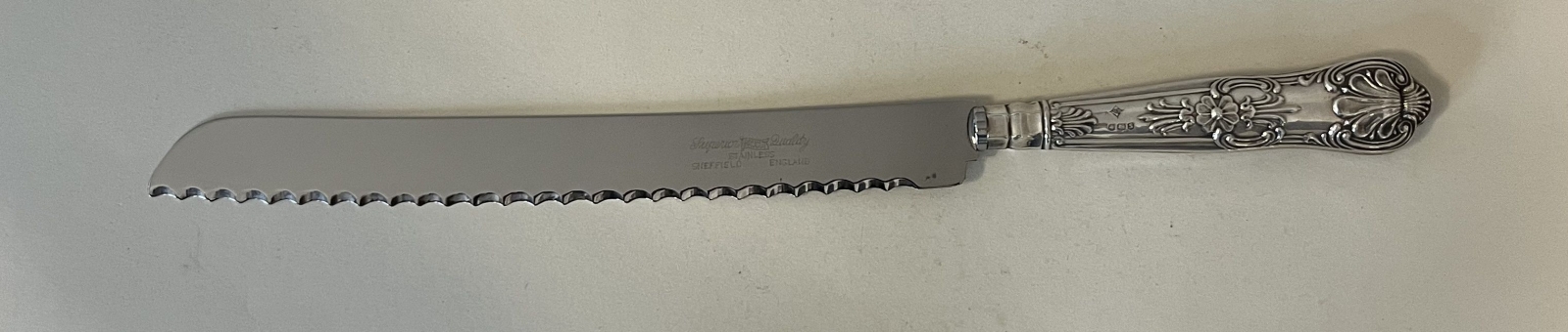 Nóż do chleba, rękojeść srebro pr. 925, cechy brytyjskie, ostrze metalowe, grawerowana nazwa zakładu: BRUCUT z Sheffield.