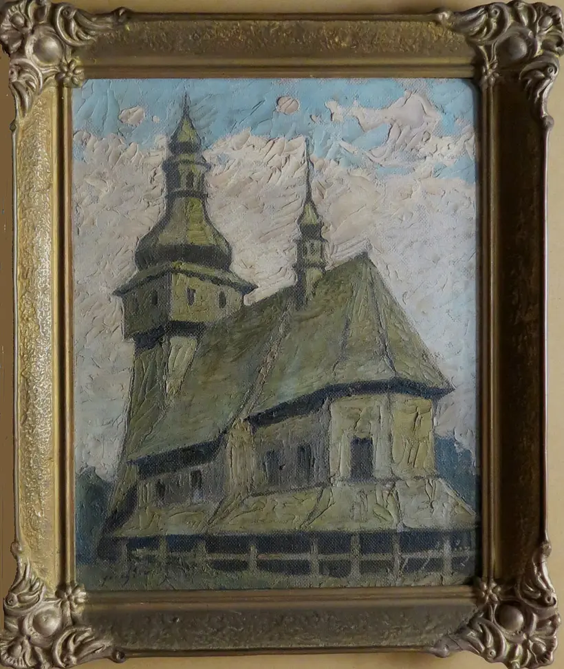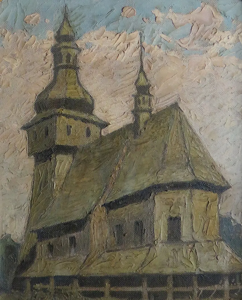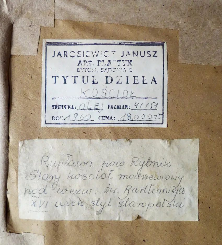 olej, płyta, 49 x 40 cm, sygn. p.d.: Jarosiewicz. Na odwrocie drukowana nalepka autorska: Jarosiewicz Janusz / Art. Plastyk / Bytom Sądowa 5 / Tytuł dzieła / „Kościół” / Technika: olej / rozmiar: 41 x 51 / Rok: 1960 / cena: 1800zł, oraz nalepka z opisem kościoła.