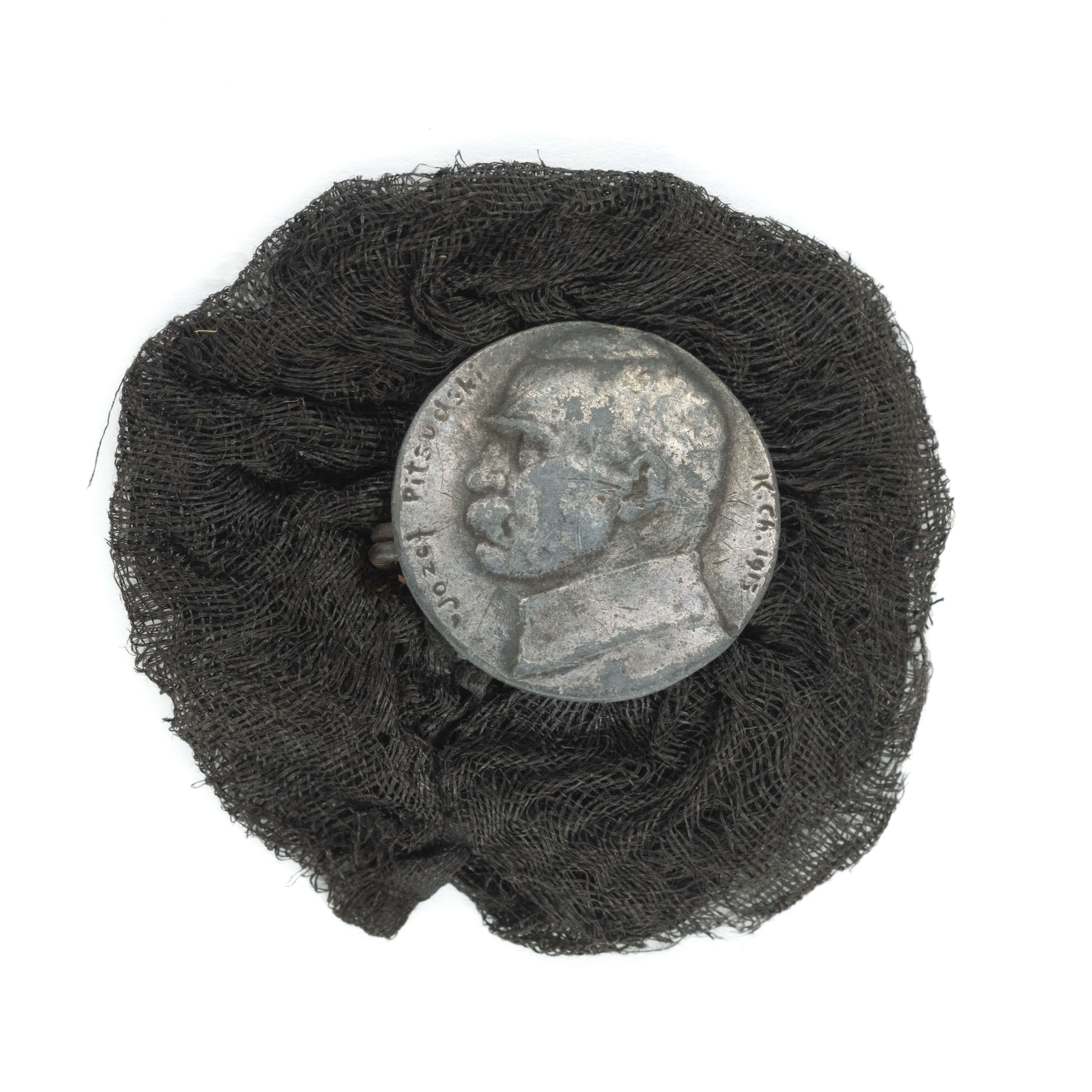 Odznaka patriotyczna Józef Piłsudski, 1915; średnica 20mm, umieszczona na kokardzie z materiału w kolorze czarnym. Mocowana na poziomą agrafkę. Stan bardzo dobry.