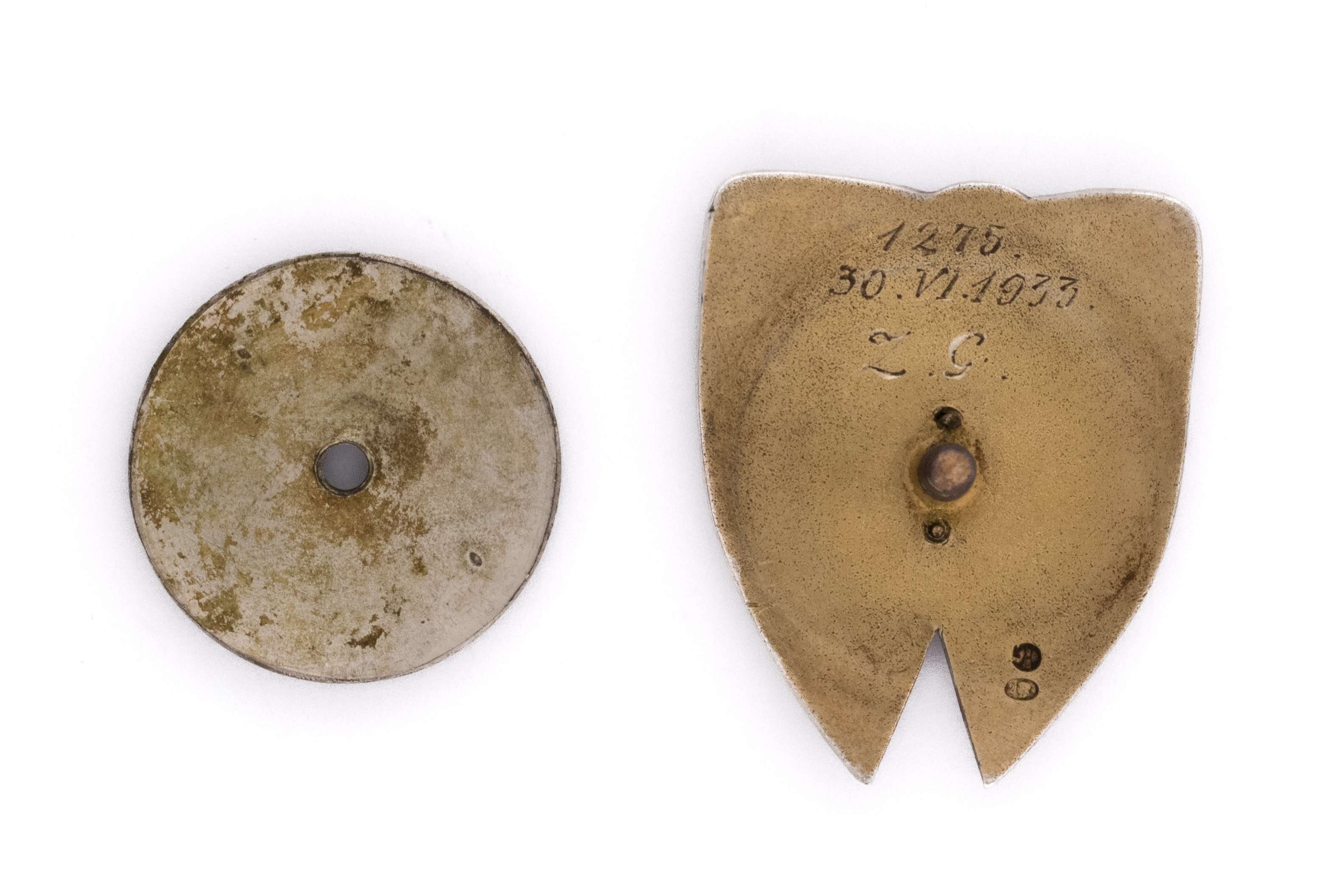 Odznaka Szkoła Podchorążych Rezerwy Kawalerii; 38,5 x 32mm. Wykonana w srebrze, złocona i emaliowana. Wieloczęściowa- monogram nakładany i mocowany na dwa zagłowione nity. Na rewersie próba srebra oraz imiennik WG- Wiktor Gontarczyk. Grawerowany numer 1275, data 20.VI.1933 oraz inicjały Z.G. Mocowana na słupek z nakrętką o średnicy 27mm sygnowaną W. Gontarczyk Warszawa, Miodowa No.19. Nakrętka bardzo dobrze spasowana do słupka. Stan bardzo dobry- nieznaczne uszkodzenia emalii.