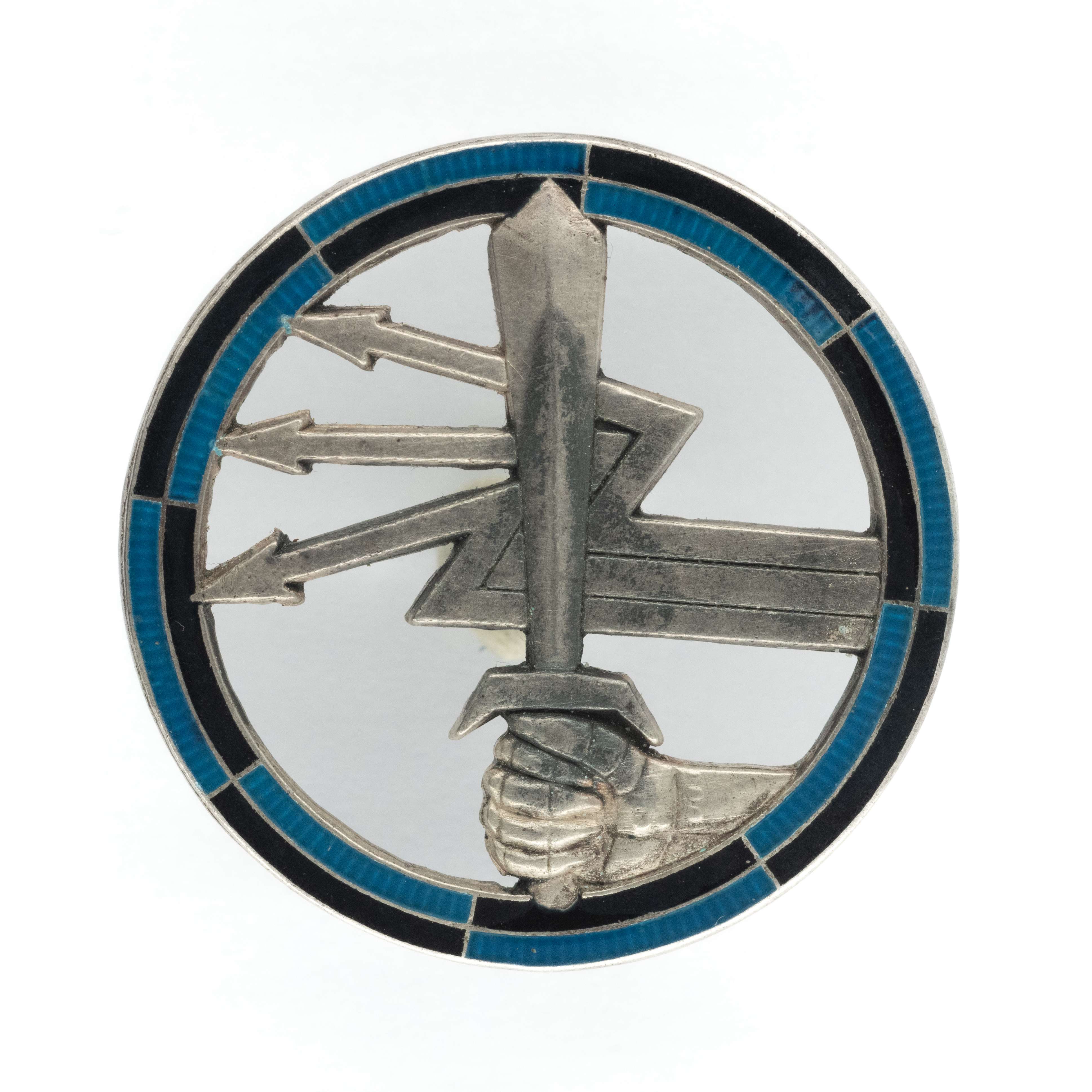 Odznaka Znak Łączności; Średnica 36mm. Wykonany w srebrze(?) emaliowany. Rewers gładki z bitym numerem169. Mocowana na słupek, brak nakrętki. Stan bardzo dobry.