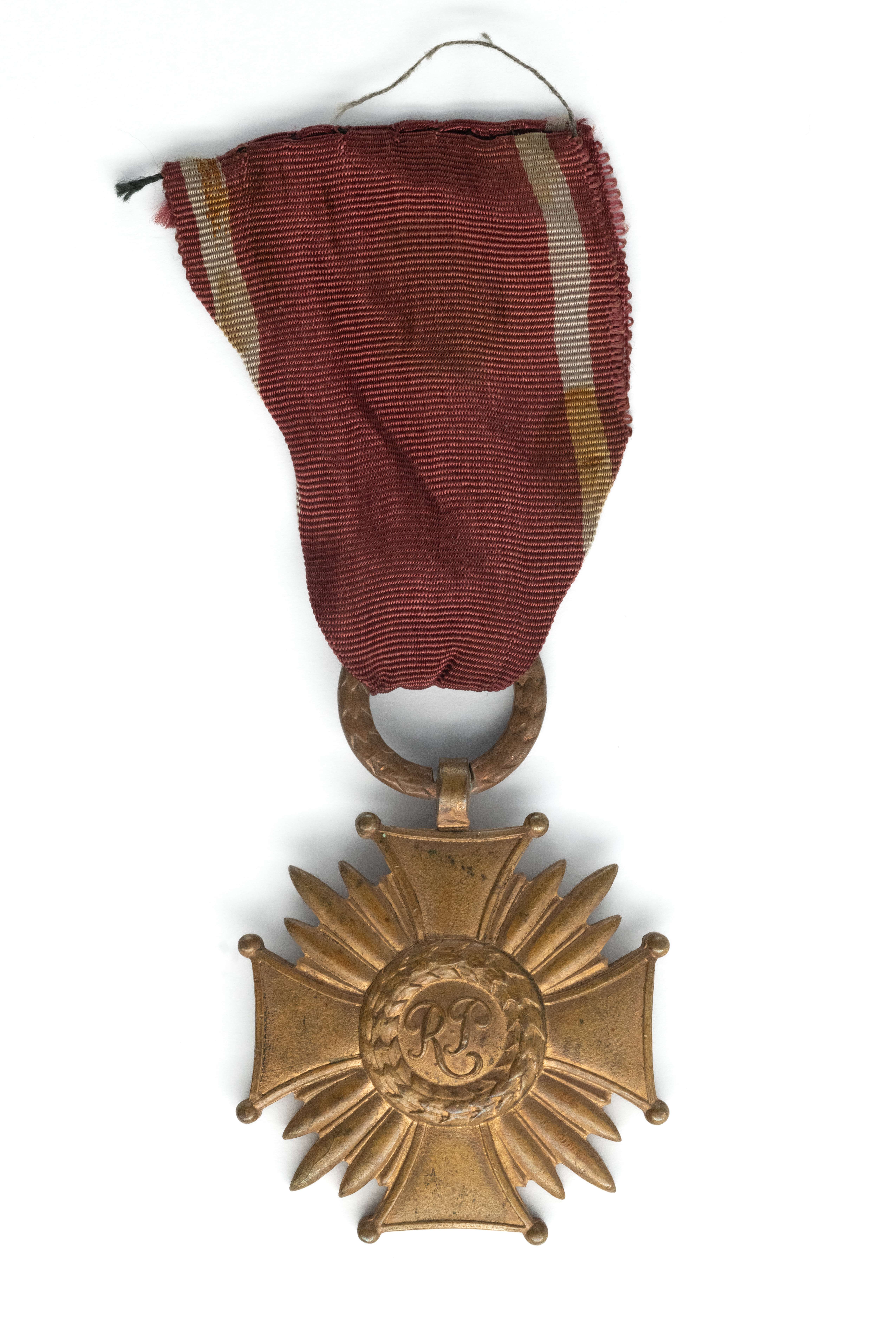 Brązowy Krzyż Zasługi - Bronisław Grabski. 41 x 46mm. Wykonany z brązu. Rewers z charakterystycznym wgłębieniem. Zawieszony na oryginalnej wstążce. Stan dobry - ślady noszenia.