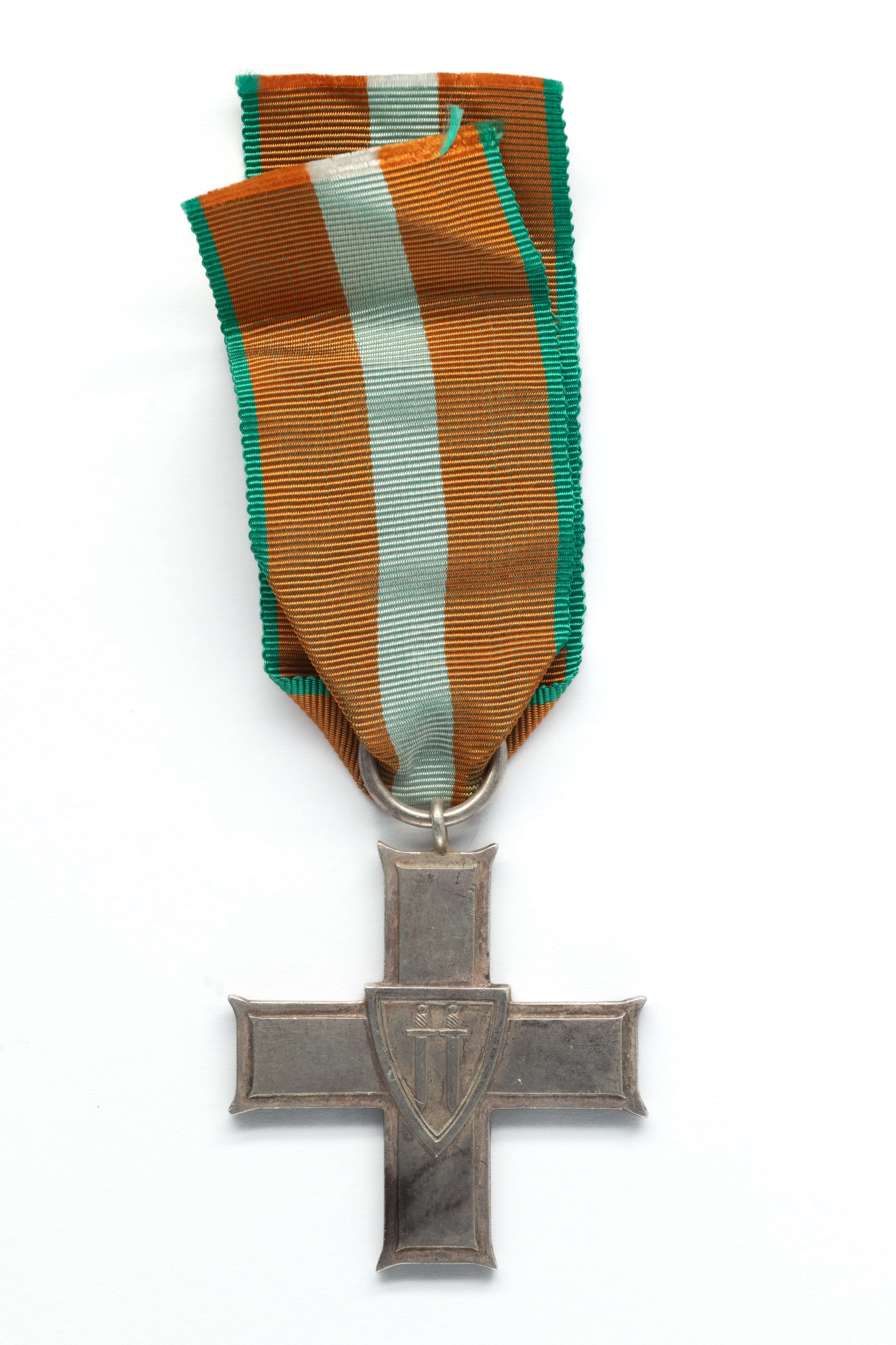 Order Krzyża Grunwaldu II klasy. 46x 56 x 3,5mm,22,7gr. Wykonany z metalu (brąz?) srebrzonego. Zawieszony na oryginalnej starej wstążce. Stan bardzo dobry.