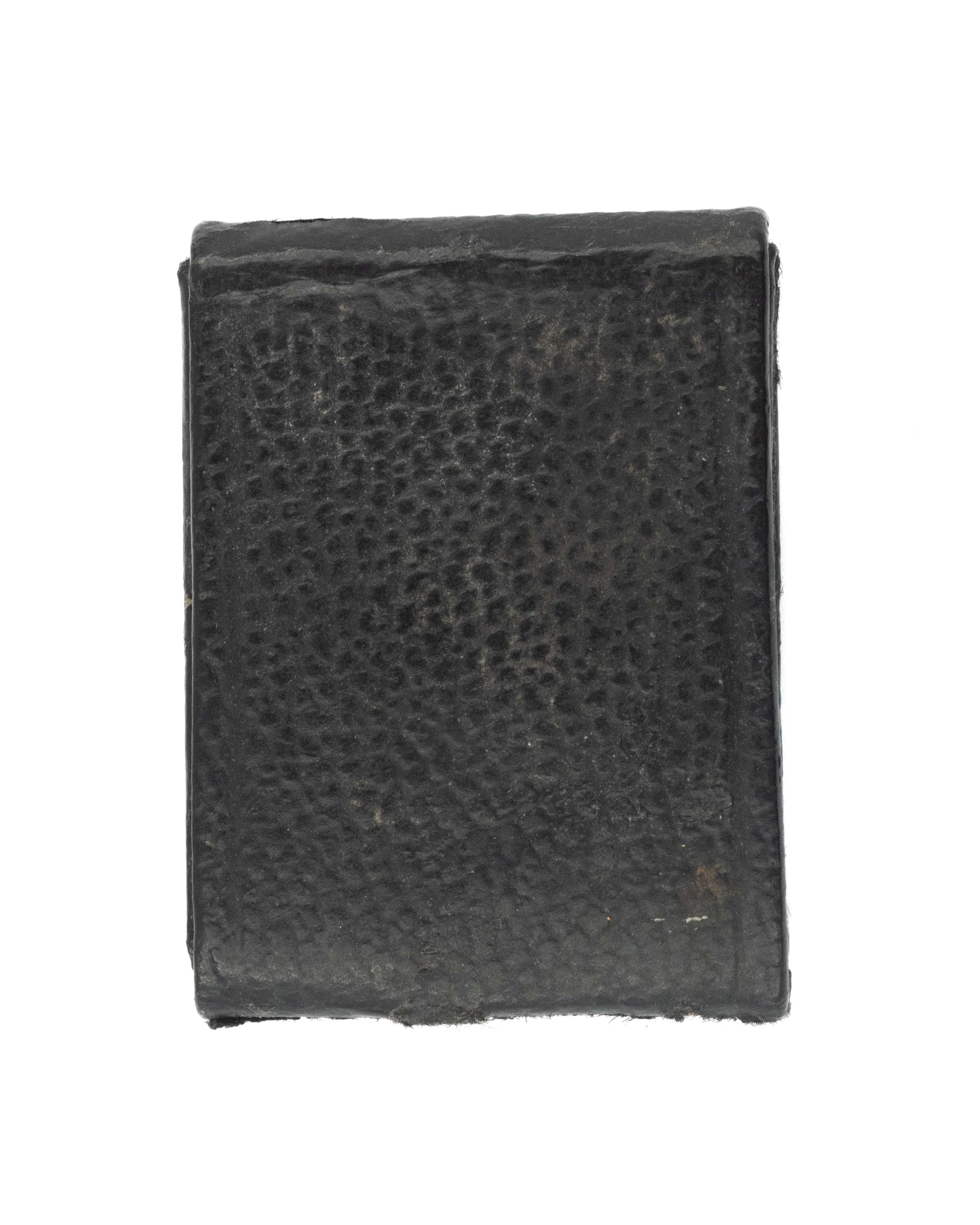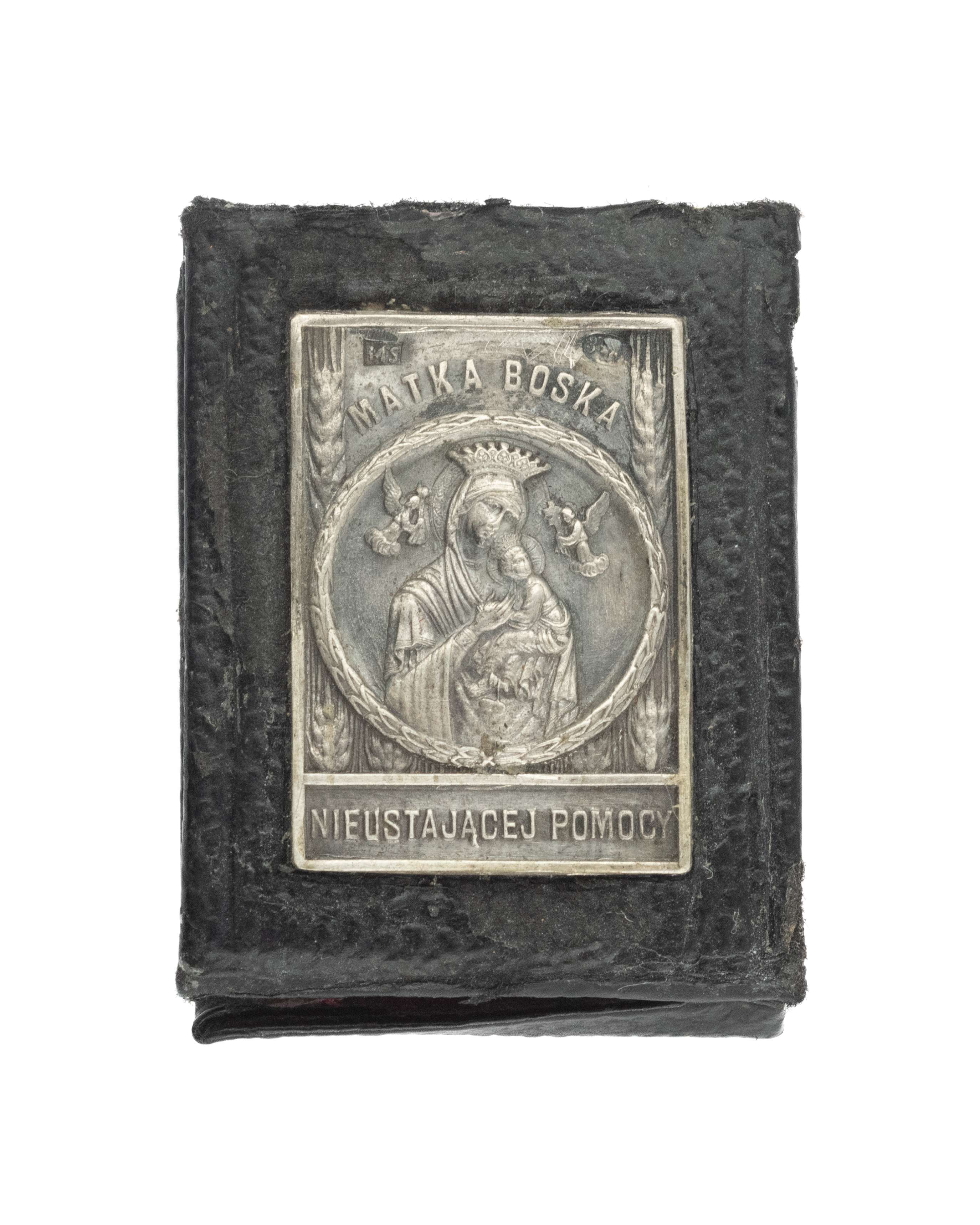 Ołtarzyk kieszonkowy z Matką Boską Nieustającej Pomocy. Srebro, skóra tłoczona, metal. 16 x 24mm. Na awersie plakietki z MB, cecha srebra 3 oraz imiennik MS. Na froncie etui tłoczony polski orzeł. Wyrób przedwojenny! Stan bardzo dobry.