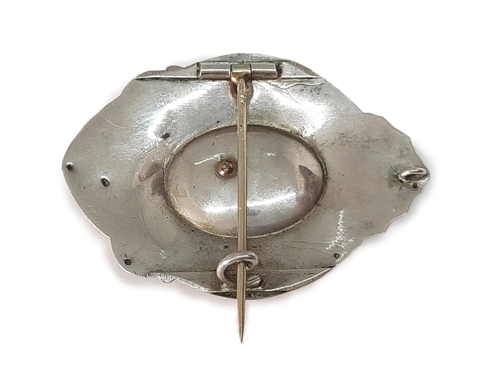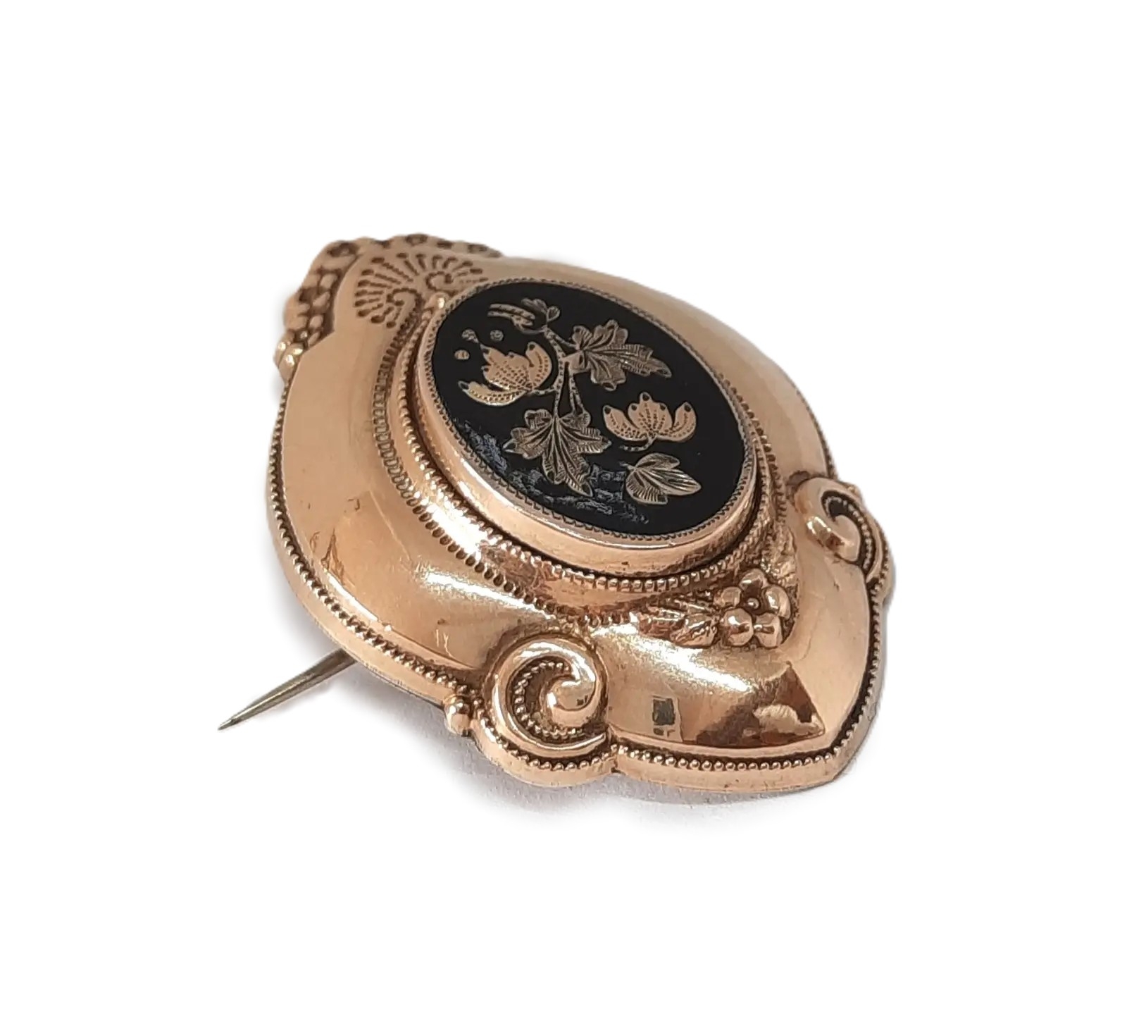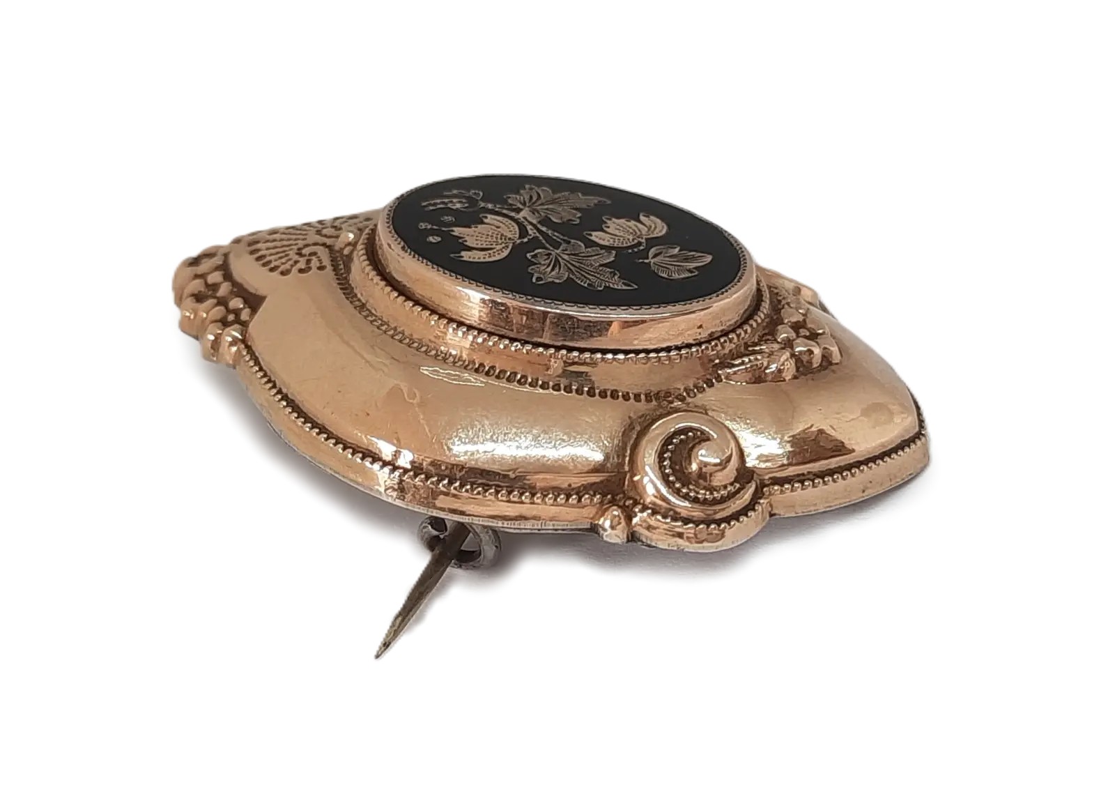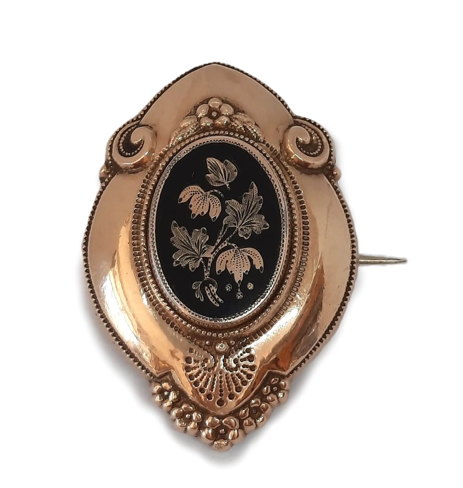 korpus broszki - złoto pr. 560; czarna emalia z centralnie na czarnym tle złoty motyw kwiatowy; element pokryty emalią - stop srebra złocony (do określenia próby wymagana analiza chemiczna - metoda niszcząca); spód broszki - srebro poniżej pr. 800; szpilka broszki - metal; masa łączna: 9,7 g; wymiary: 4,5 x 3 cm; stan zachowania: ślady użytkowania; ok. poł. XIX w.