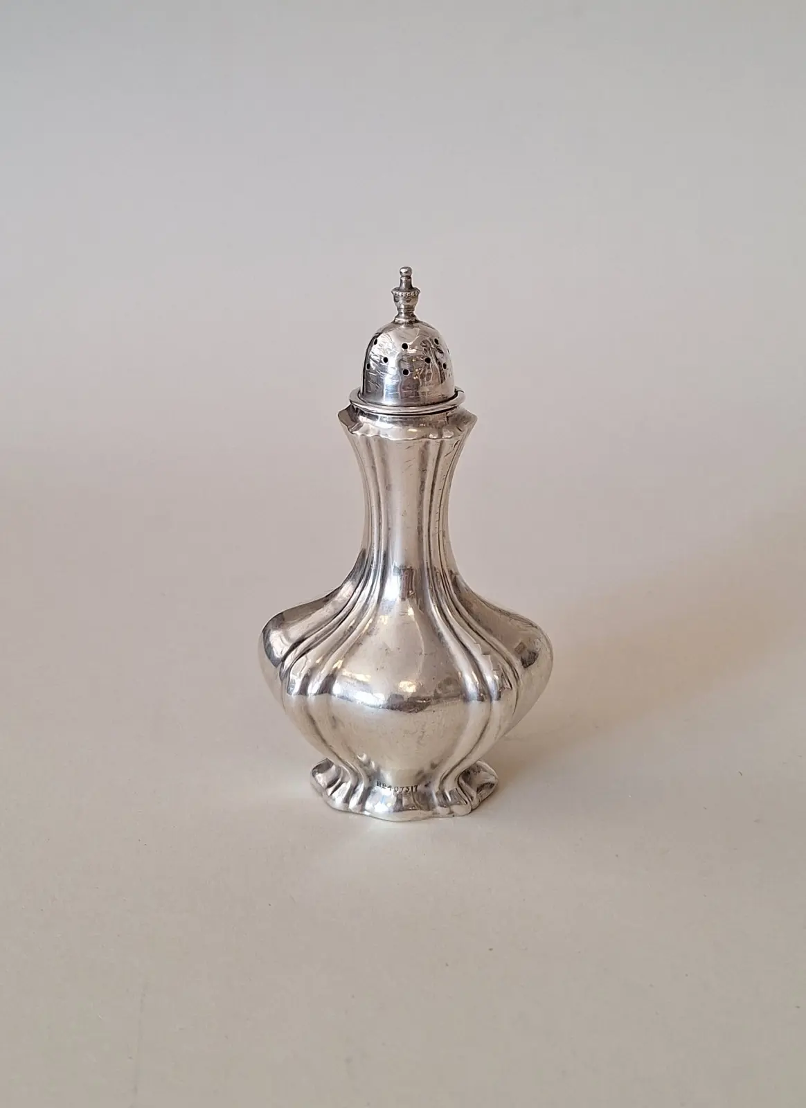 Solniczka srebrna, cecha probiercza - srebro pr. 925. Cecha krajowa Anglii. Cecha miejska miasta Birmingham. Cecha złotnika H.H & Co.- prawdopodobnie H. Humphries & Company z Birmingham, cecha datująca z roku 1911. Waga 42,4 g. Drobne wgniecenia.