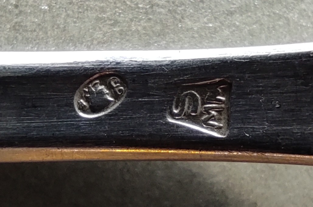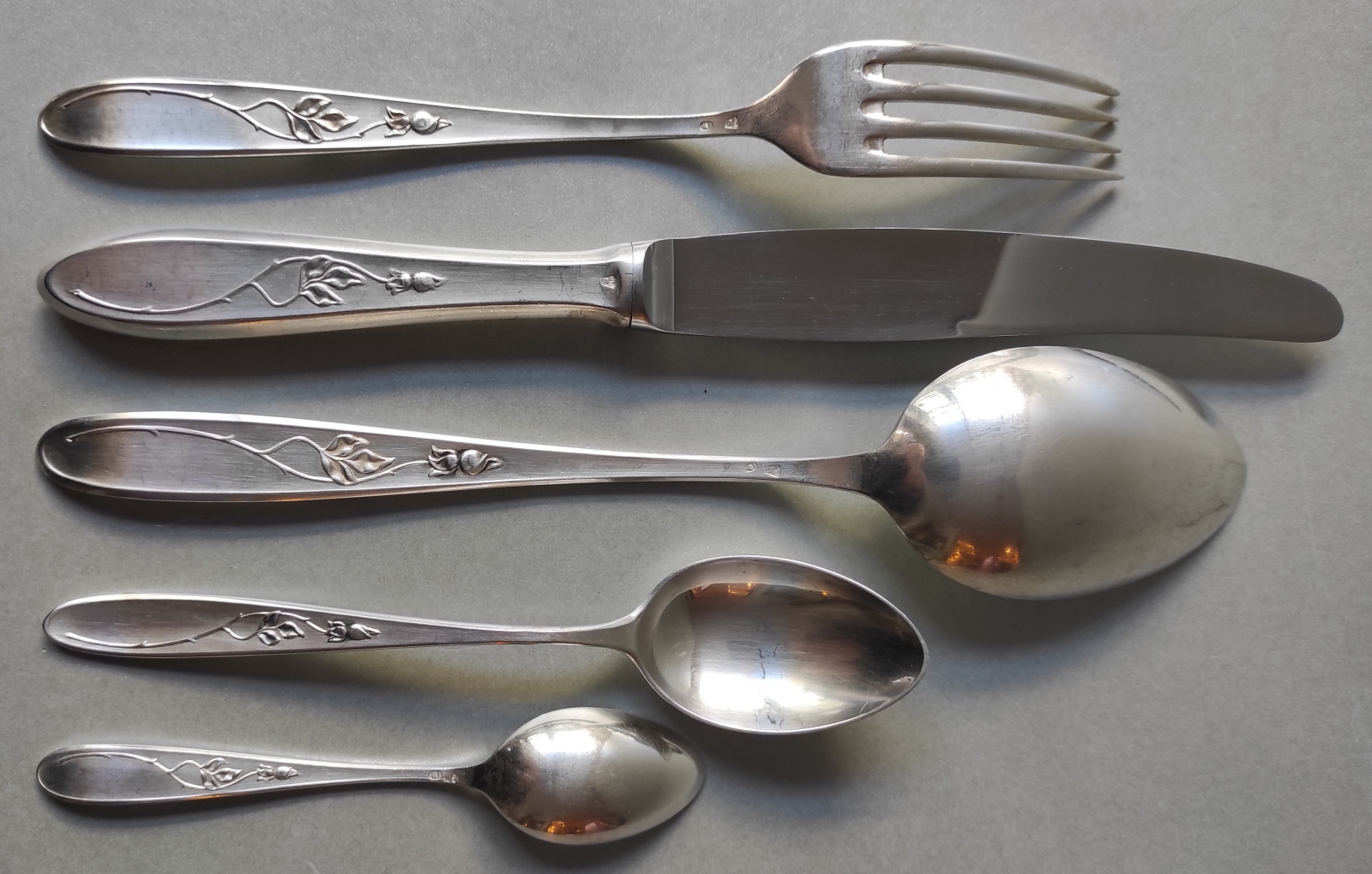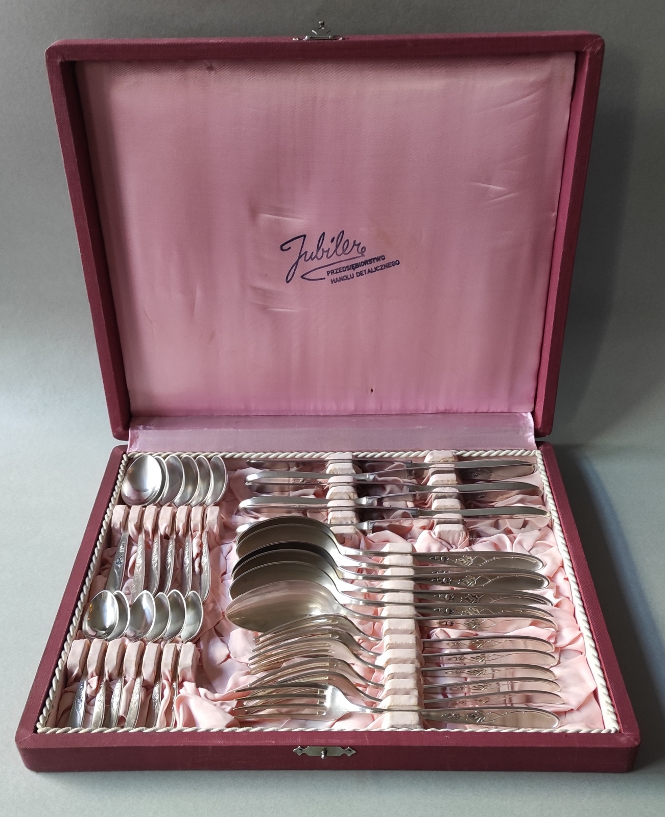 6 łyżek, 6 noży, 6 widelców, 6 łyżeczek do herbaty, 6 łyżeczek do mokki;                  łącznie 30 sztuk; srebro pr. 3 (0,800), polska cecha z lat 1931 - 1963, Urząd Probierczy w Warszawie, WWS (Warszawska Wytwórnia Sreber), wzór "Angielski";  waga łącznie: 1149 g., w tym noże: 377 g. , ostrza noży ze stali nierdzewnej