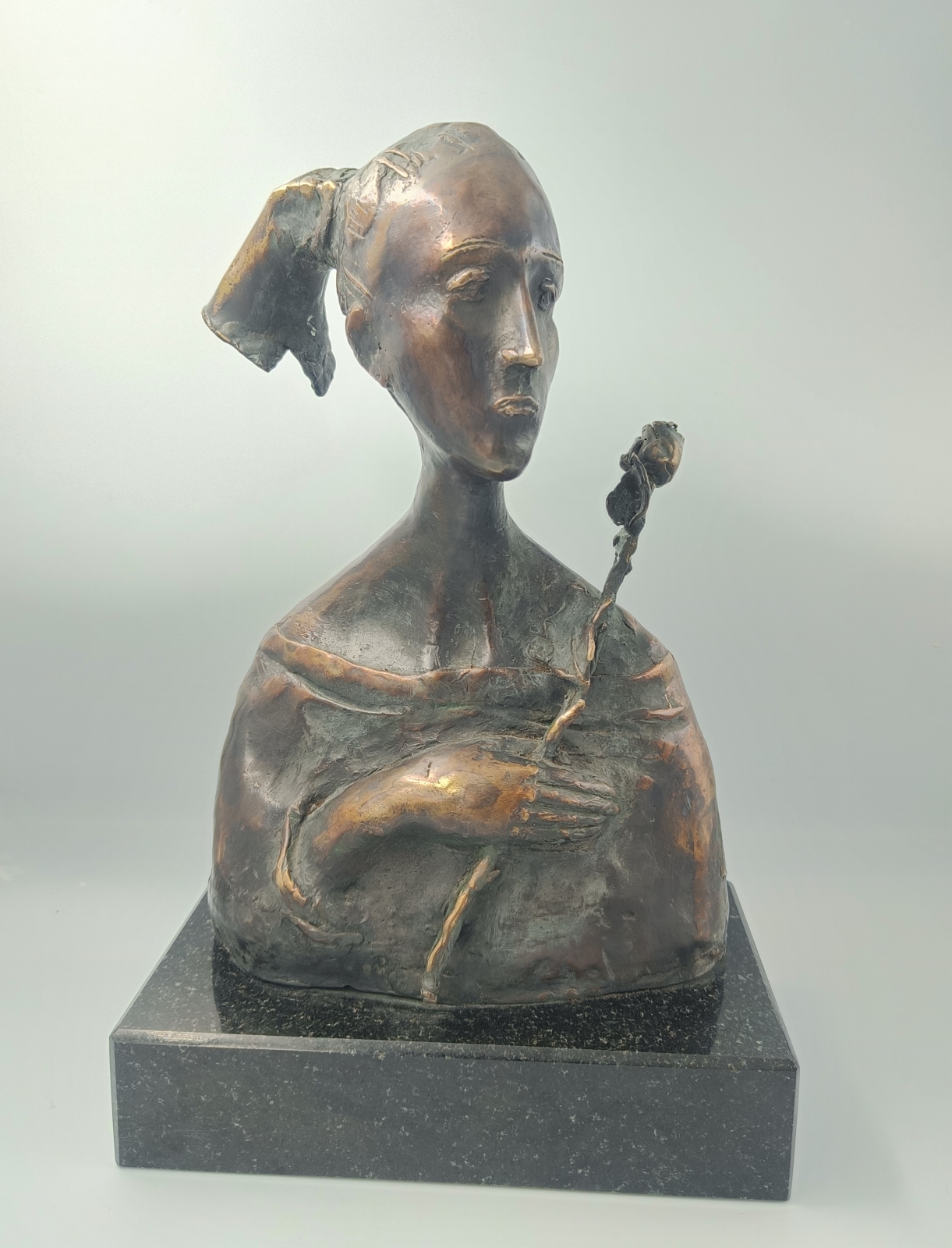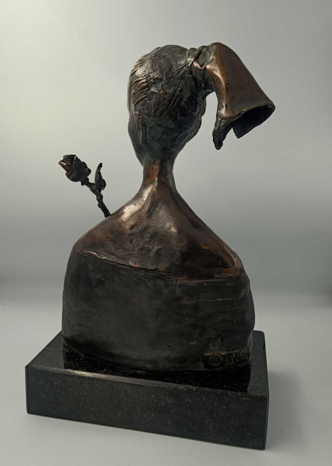 Brąz patynowany, wys. 35 cm, 1/1, podstawa granitowa: 23 x 13 x 5 cm, syg. tył: "K 2015". Metoda na wosk tracony.