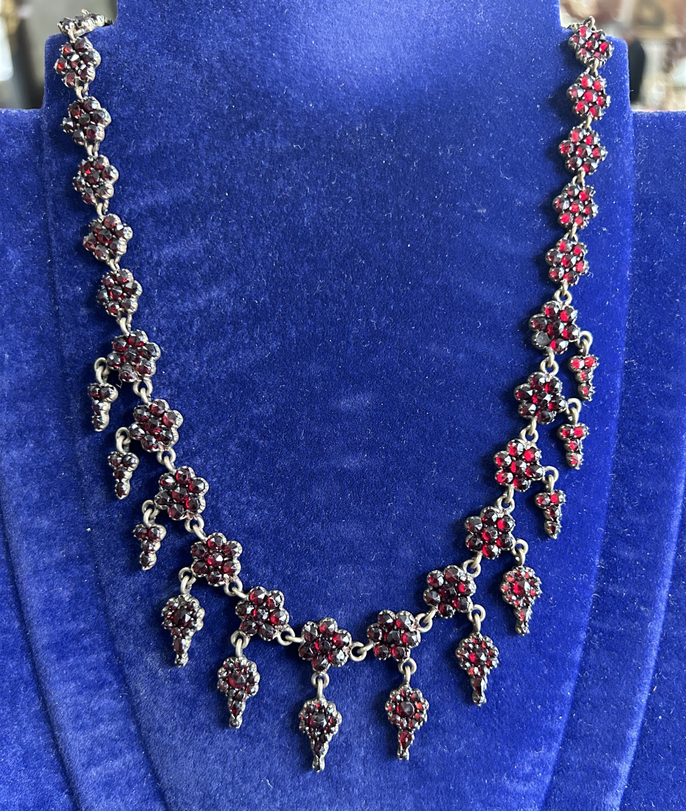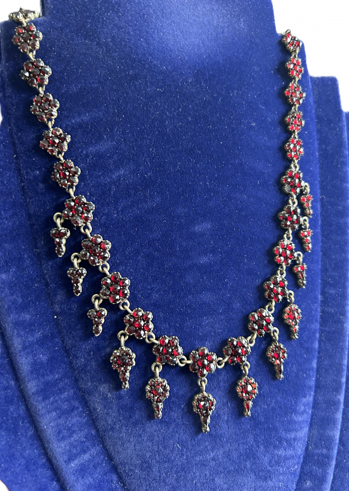 Naszyjnik metalowy z granatami naturalnymi. Brak dwóch kamieni.