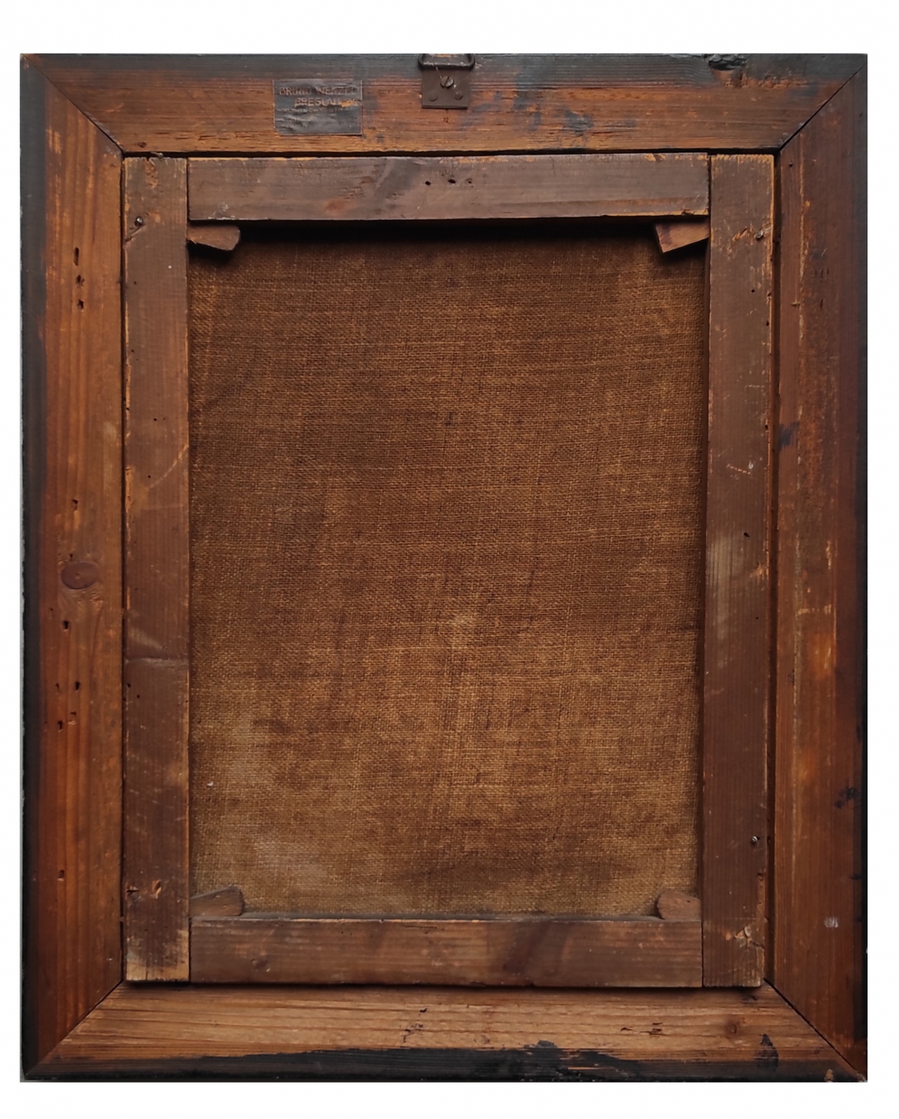 olej, płótno; 40 x 31 cm;  niesygnowany.  Obraz oprawiony, na ramie drukowana firmowa nalepka: Bruno Wenzel / Breslau / Albrechtstrasse 11/ Kunsthandlung und / Rahmenwerkstatten.  Stan zachowania: obraz wycięty, bardzo liczne przemalówki    i ubytki malatury, płótno sfalowane.