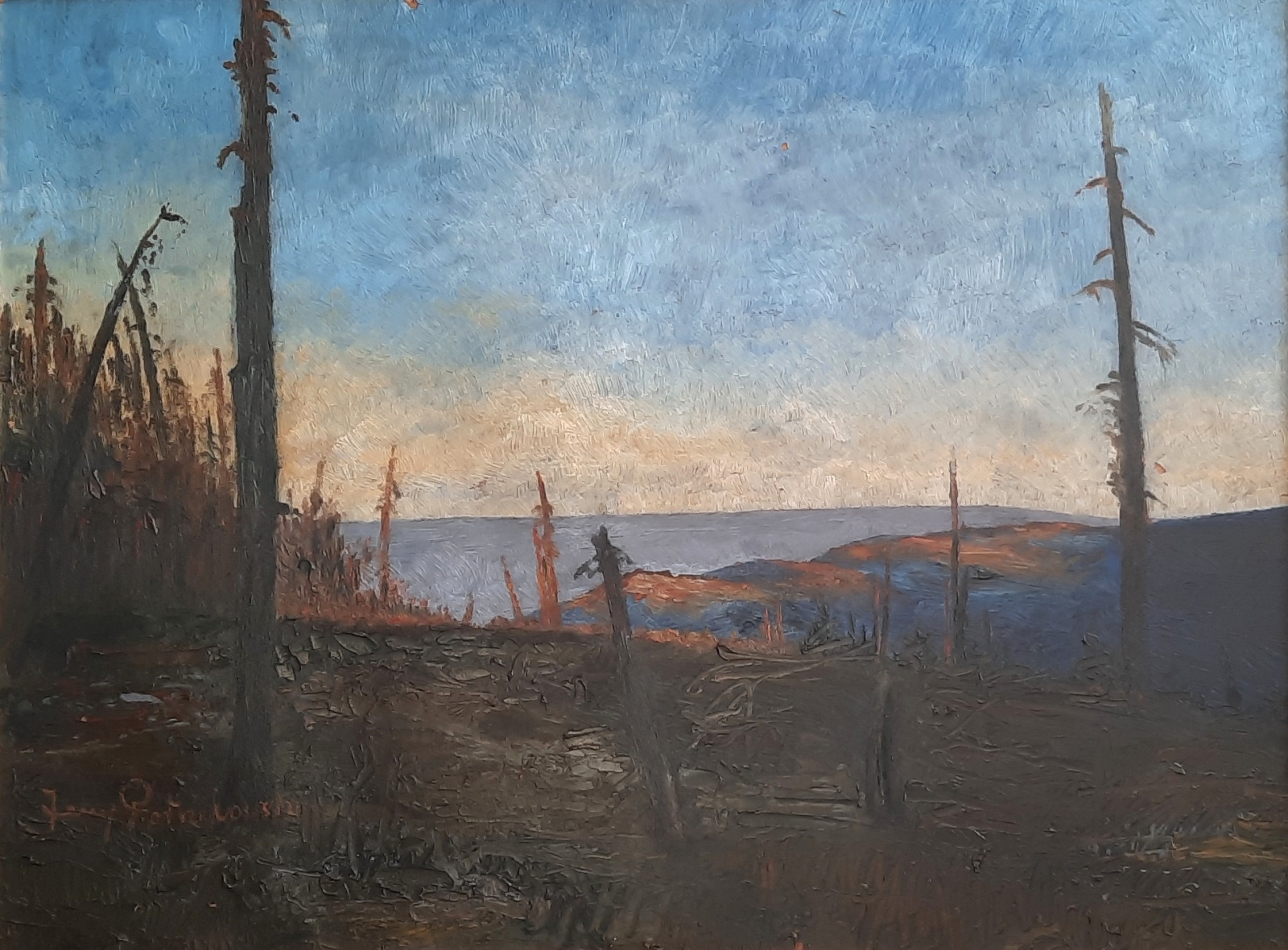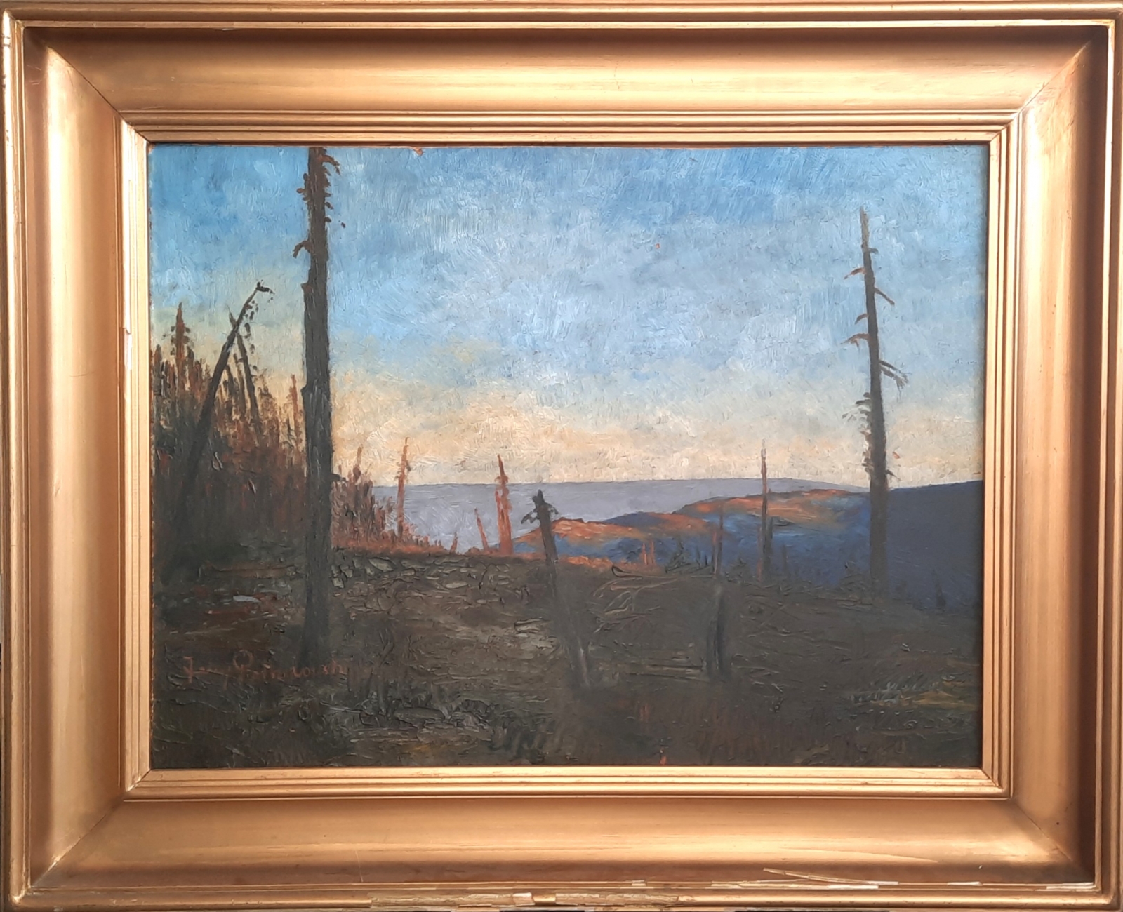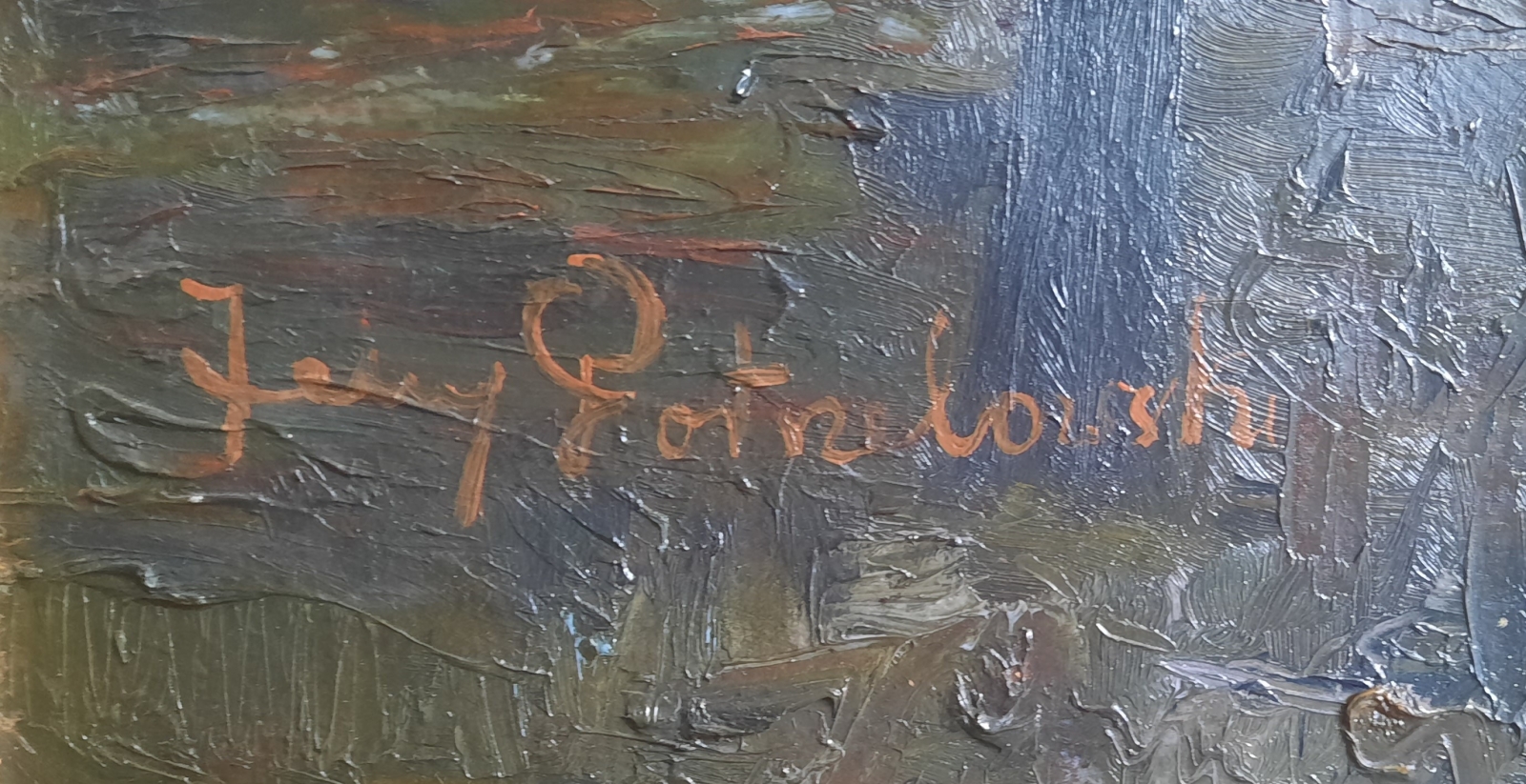olej / tektura; sygn. l.d.: Jerzy Potrzebowski; wymiary: 46 cm x 61,5 cm; oprawa drewniana, złocona, aplikacje gipsowe; stan zachowania: ubytki ramy