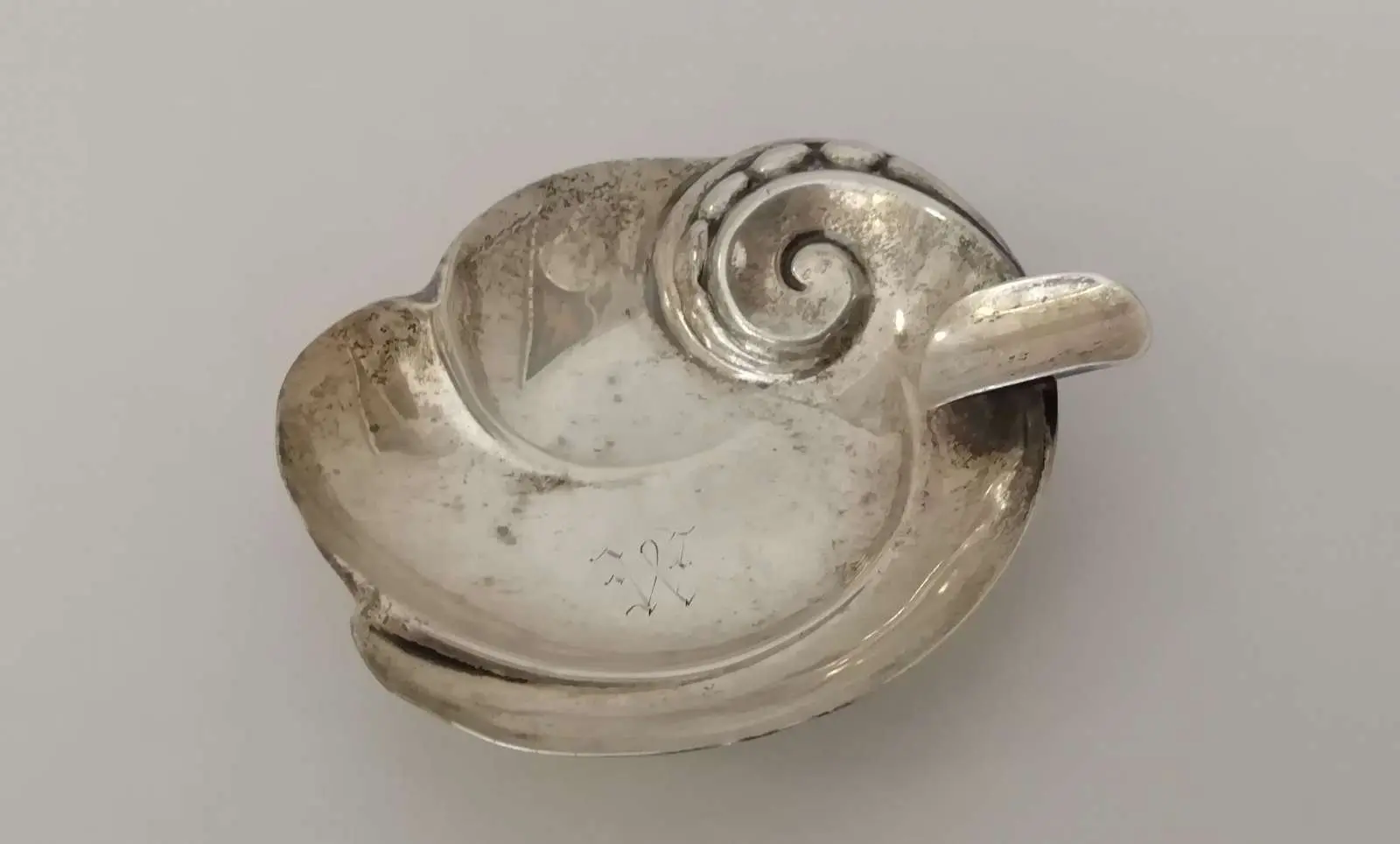 Popielniczka srebrna pr. 925, w. 28,7 g, dł. 8 cm, sygn. Sterling, na odwrocie monogramy R D, oraz liczba 40. I połowa XX wieku.