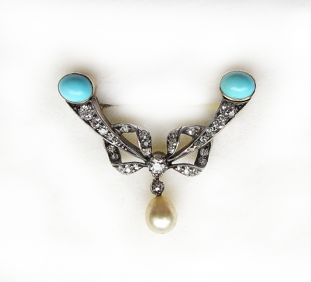 Złota broszka z diamentami, turkusami i perłą, ok. 19106 500 zł