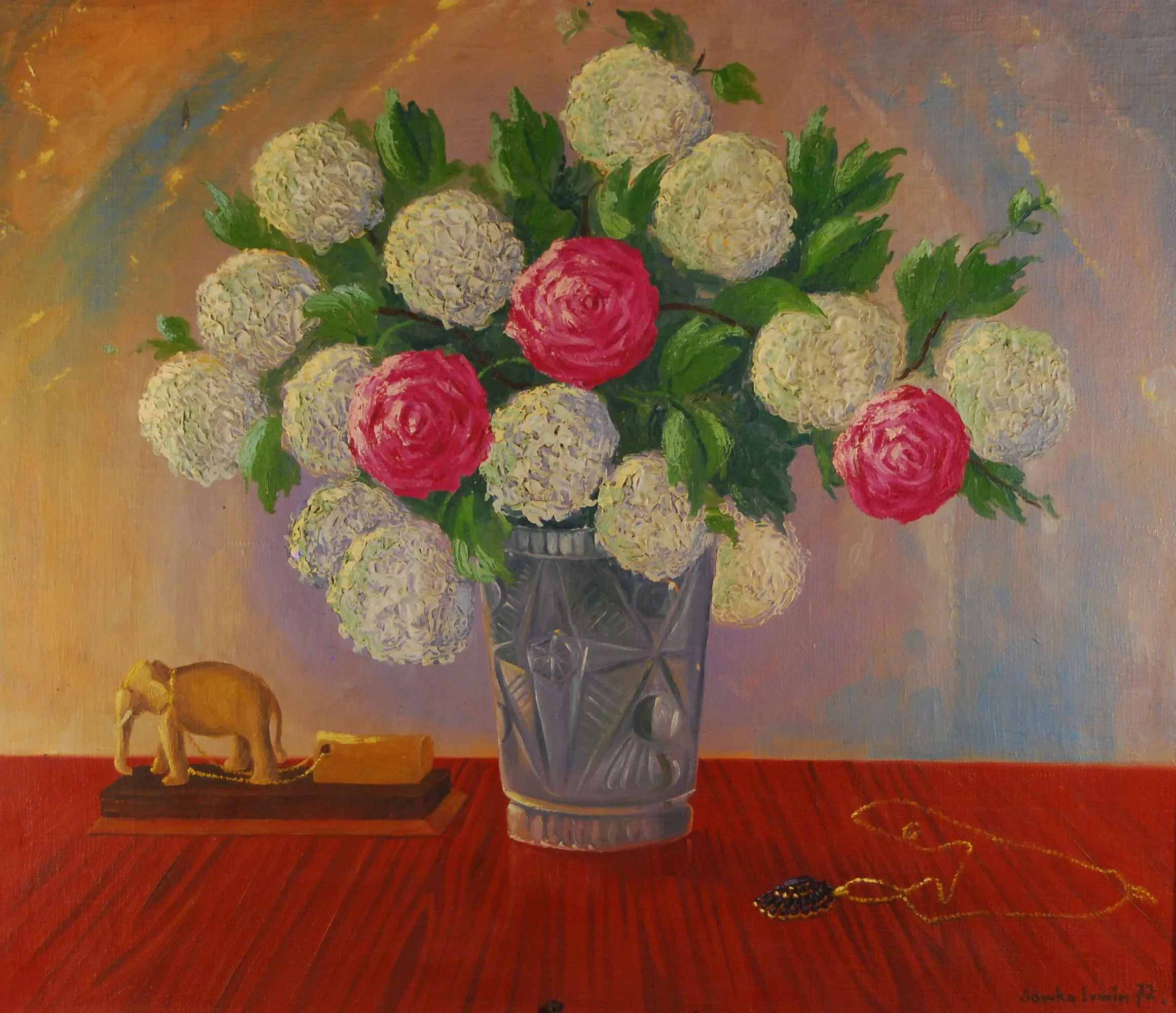 olej, płyta pilśniowa, 50 x 60 cm; sygn. p.d.: Sówka Erwin 72.; Na odwrocie napis flamastrem: Sówka Erwin / Kwiaty / 1972r. / 60 x 50