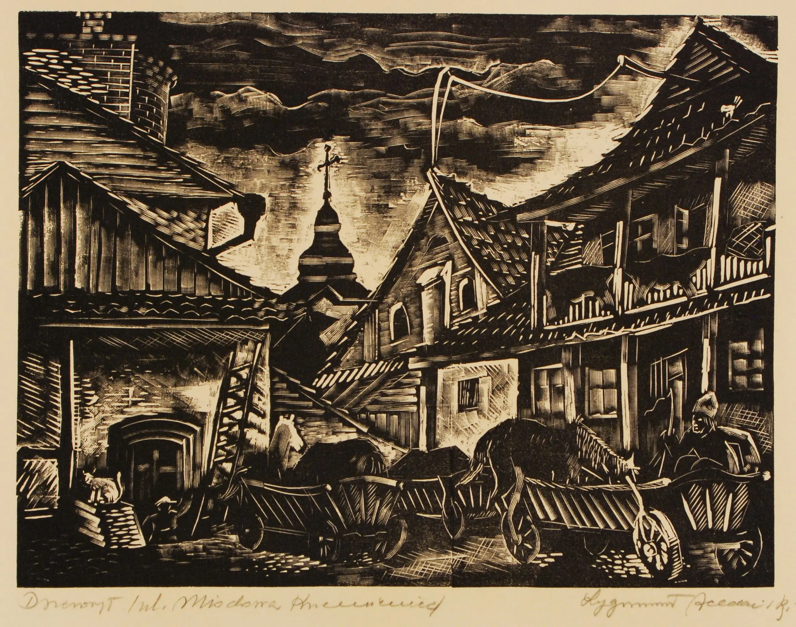drzeworyt, 18,5 x 23,7 cm; sygn. oł. p.d.: Z. Acedański; l.d.: Drzeworyt (ul. Miodowa Krzemieniec); Grafika reprodukowana w: I. Rylska "Katalog zbiorów grafiki tom I", MN we Wrocławiu, Wrocław, 1983, str. 61, kat. 2. W. Odorowski, D. Sewer-Puchalska "Kolonia artystyczna w Krzemieńcu nad Ikwą", Muzeum Nadwiślańskie, Kazimierz Dolny, 2010, str. 53.
