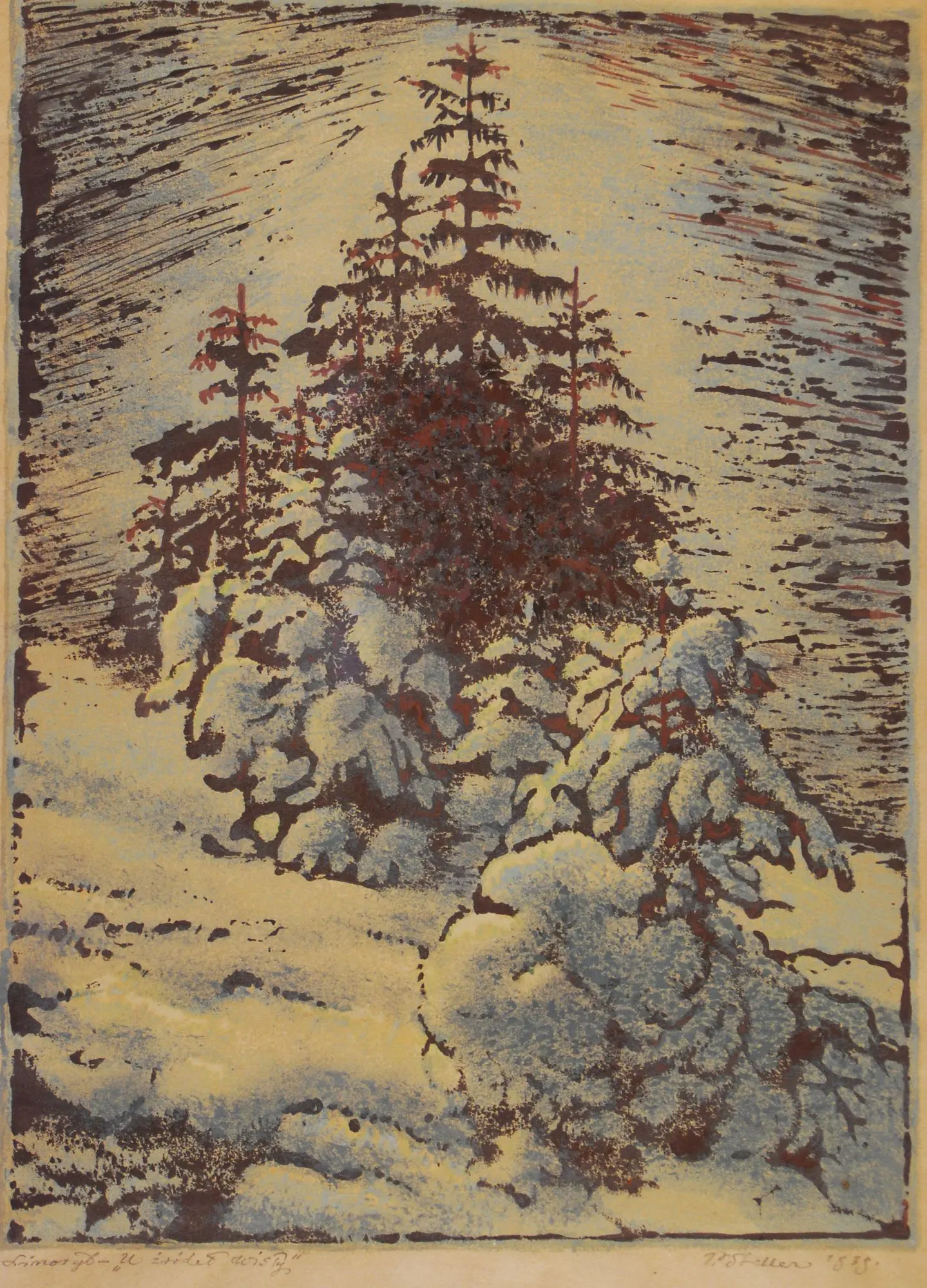 linoryt barwny, 32 x 22,8 cm; sygn. oł. p.d.: P. Steller 1939; l.d.: Linoryt - "U źródeł Wisły".; Praca reprodukowana w: "Paweł Steller. Życie i twórczość (1895-1974)", Muzeum Historii Katowic, Katowice, 2006, s. 250, il. 340.