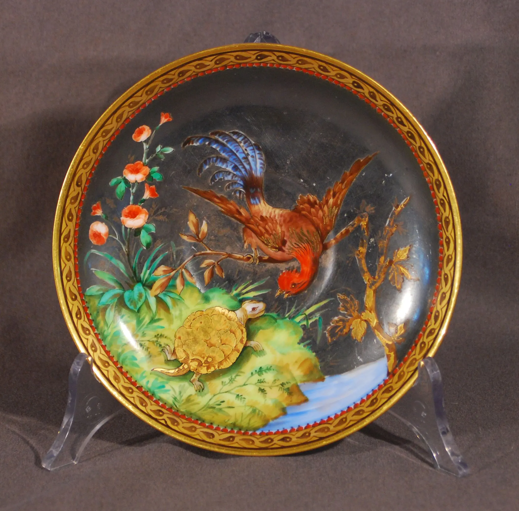 porcelana, farby naszkliwne, srebrzenie, złocenie, śr. 14,5 cm, w lustrze malowany motyw żółwia i siedzącego na gałęzi ptaka, znak drukowany czerwony Fabryki Kuzniecowów w Dulewie.; Rosja, XIX/XX w.