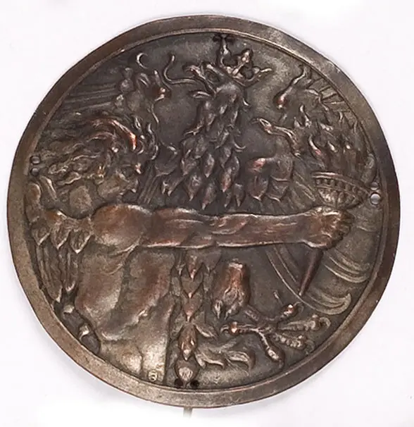 średnica 44 mm, miedź. Rewers z kontrą, otwory do przyszycia, wtórna szpilka na kleju. Stan dobry.