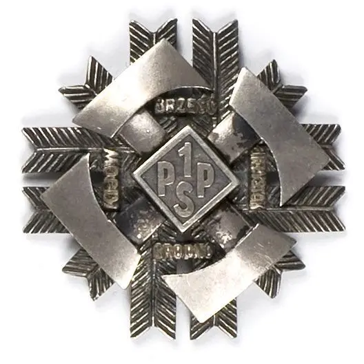 oficerska, 40 x 40 mm, srebro. Odznaka trzyczęściowa. Rewers gładki, Sygnatura "AB" i próba srebra, grawerowany napis: "POR 1 PSP W.BIEL 1939", numer "544". Słupek, nakrętka sygnowana A. Batko Nowy Sącz. Stan dobry.