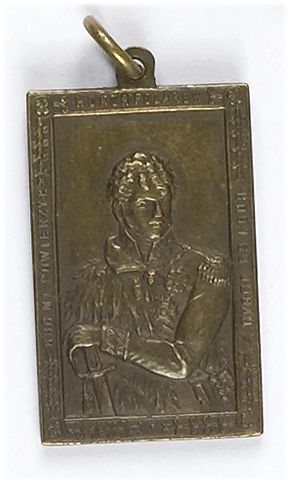 18 x 33 mm, mosiądz Dwustronny na awers sylwetka J Poniatowskiego, wokół napis: "BÓG MI POWIERZYŁ HONOR POLAKÓW BOGU GO ODDAM" Na rewersie napis "19. X. 1813-1913" Uszko do zawieszania. Stan dobry.