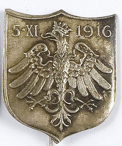 Aukcja 129 / Poz. 111 - Odznaka patriotyczna 5 listopad 1916 r. Tarcza z orłem. U góry napis