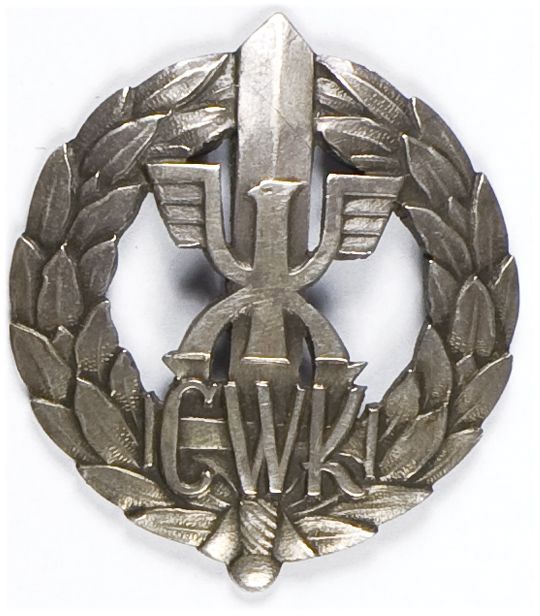 wym. 41 x 47 mm. Wykonana w srebrze. Rewers gładki z cechą srebra oraz imiennikiem "WG". Mocowana na słupek z nakrętką sygnowaną "W. Gontarczyk Warszawa". Do odznaki dołączona legitymacja z 1949 r. Stan zachowania bardzo dobry.