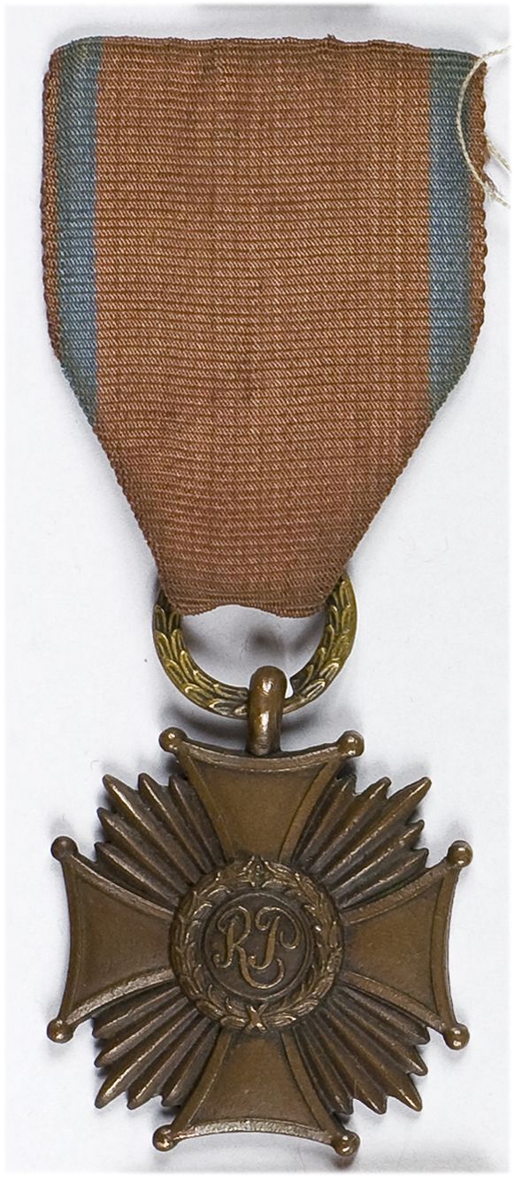 wym. 39 x 46 mm. Wykonany w mosiądzu, umocowany na oryginalnej wstążce (podszyta od wewnątrz fragmentem mapy).Wersja z wklęśnięciem na rewersie - wykonanie moskiewskie. Do krzyża dołączone tymczasowe zaświadczenie z 1946 r. potwierdzające nadanie. Stan zachowania dobry.