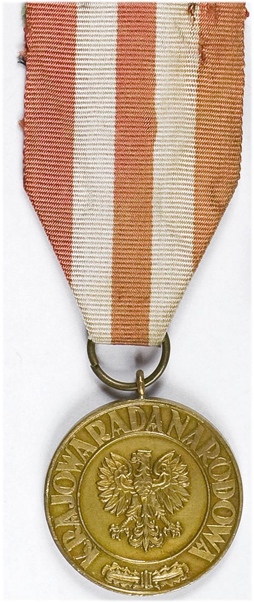 śr. 33 mm. Wykonany w mosiądzu. Umocowany na oryginalnej wstążce. Do odznaczenia dołączona legitymacja z 1959 r. potwierdzająca nadanie. Stan zachowania dobry.