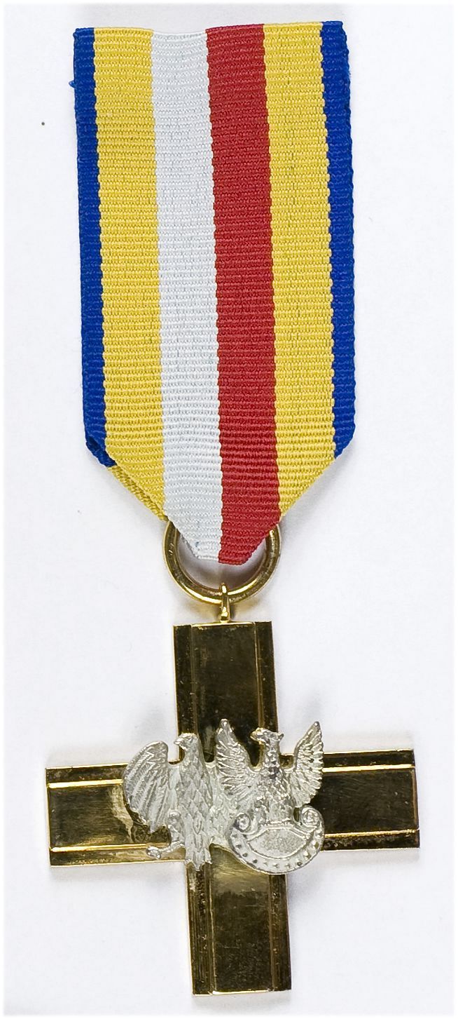 wym. 44 x 49 mm. Wykonany w metalu, wieloczęściowy (orzeł i kurica nakładane), umocowany na oryginalnej wstążce. Do odznaki dołączona legitymacja z 2010 r. potwierdzająca nadanie. Stan zachowania bardzo dobry.