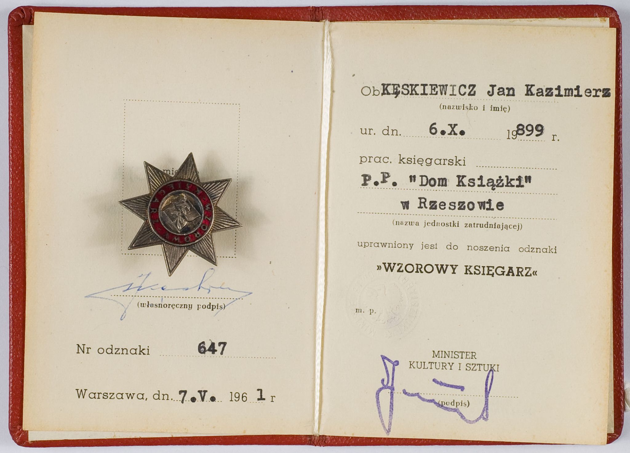 34 x 34 mm. Wykonana w metalu, emaliowana. Mocowana na słupek z nakrętką sygnowaną "Mennica Państwowa". Do odznaki dołączona legitymacja z 7.51961r. Stan zachowania bardzo dobry