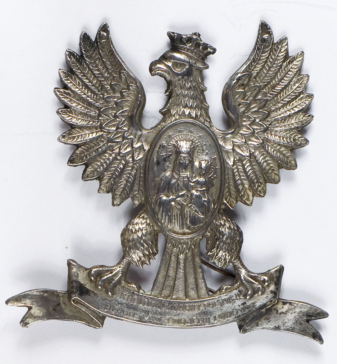 na dole szarfa z napisem: "Królowo Korony Polskiej błogosław swemu ludowi", 85 x 85 mm, tombak srebrzony. Rewers gładki, napis ZUP 156, podpórka. Stan dobry