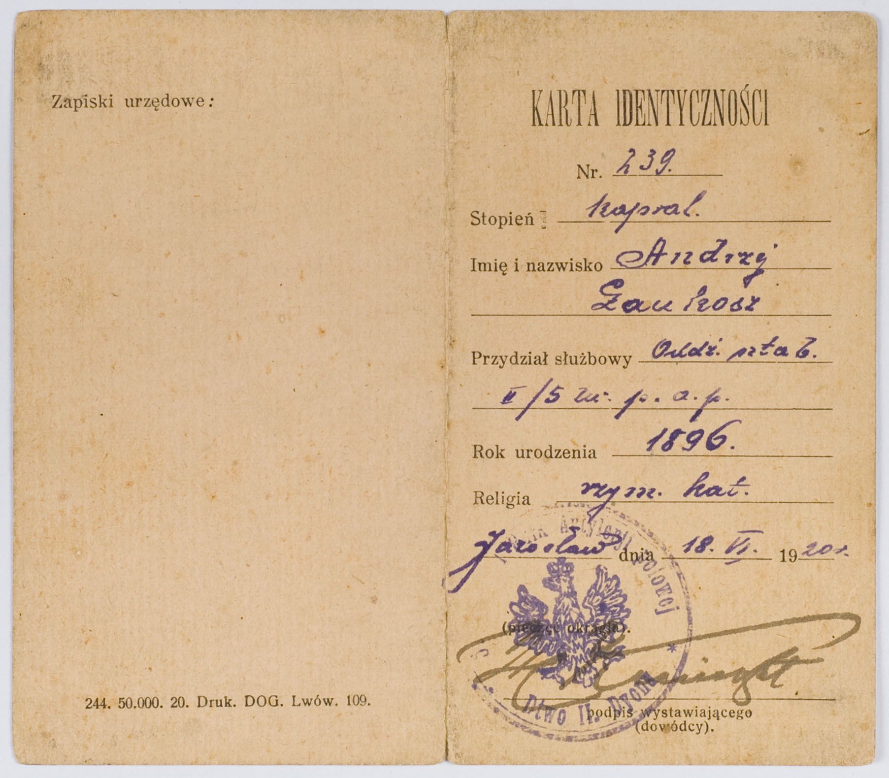 Nr 239 dla kaprala Andrzeja Lankosza ważna na rok 1920 5 Lw. Pułk Artyleryi polowej Odział Sztabowy II Dywizyonu. Stan dobry