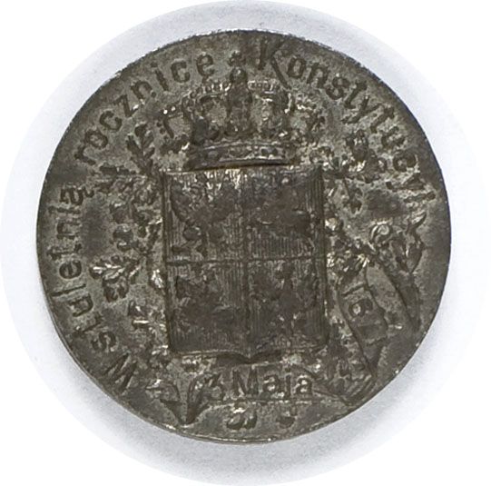 A: Tarcza herbowa Rzeczypospolitej i napis w otoku W Stuletnią rocznicę Konstytucyi 3 Maja, R: Orzeł w tarczy na tle łańcuchów, kosy, młota, wyżej napis: 3Maja 1891, w półkolu WARSZAWA, Nie sygnowany, 36 mm, cyna. Stan dobry