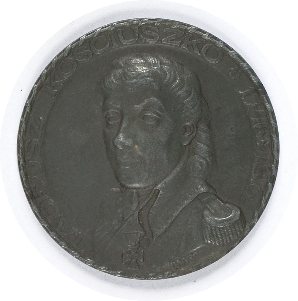 A: Popiersie w lewo, w otoku napis TADEUSZ KOŚCIUSZKO 1917 R: Widok na Wawel, w otoku napis: ON ZERWAŁ KAJDANY W KTÓRYCH JĘCZAŁ NARÓD, na dole TOW. NUM. KRAK. 15.X.1917 Sygnowany na A.: J. WYSOCKI, bity w Wiedniu, średnica 70 mm, cynk. (1000 egz. - Strzałkowski poz. 400). Stan b. dobry