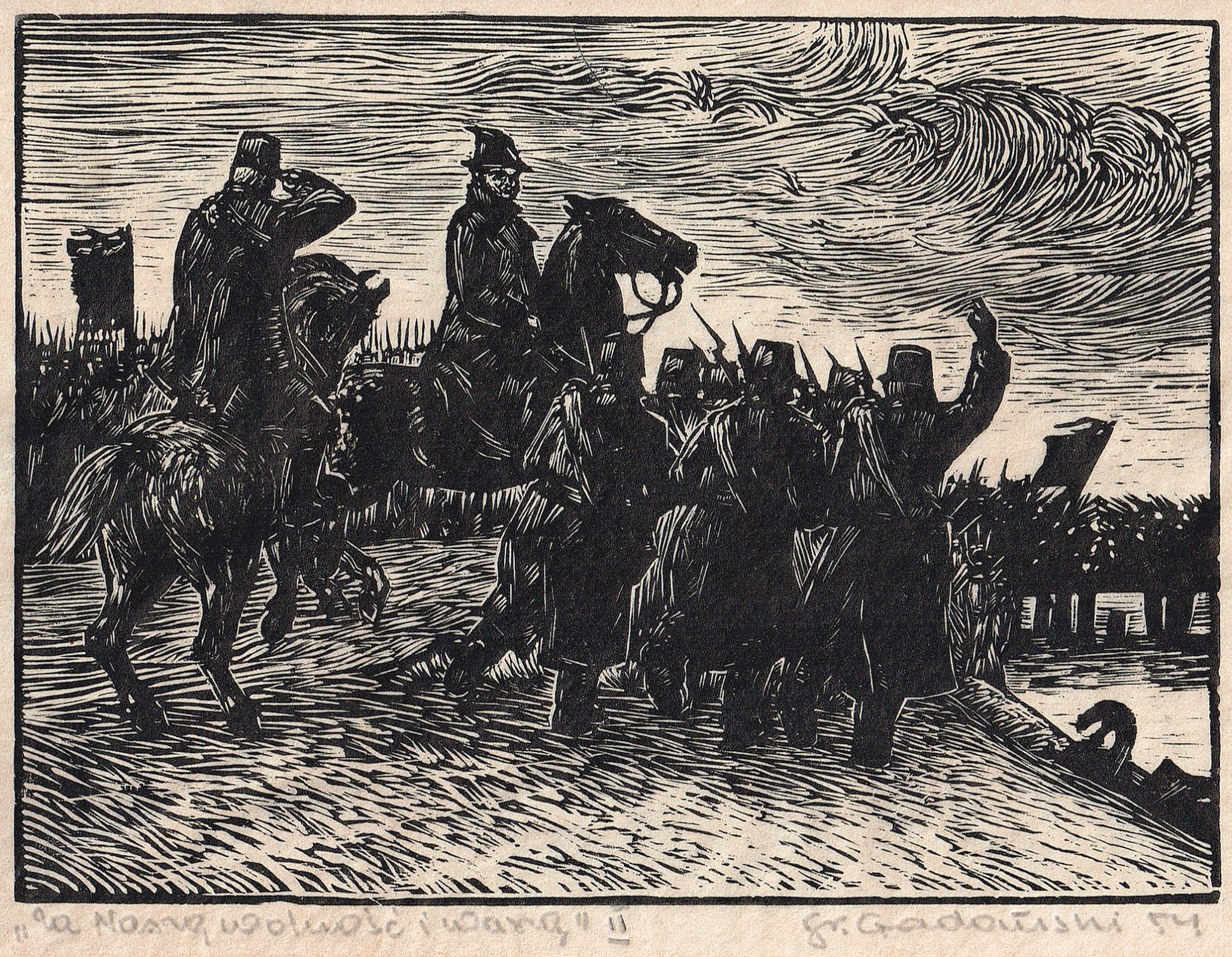 drzeworyt, 14,5 x 19 cm, sygn. oł. p.d.: St. Gadomski 54; l.d. oł.: "Za naszą wolność i waszą" II. Na odwrocie passe-partout pieczęć autorska oraz 2 naklejki: 1. Pismem maszynowym tytuł grafiki; 2. Drukowana wypełniona ołówkiem CBWA Pl. Małachowskiego 3 Warszawa, okręg Stalinogród. Grafika ze zbiorów rodziny artysty.