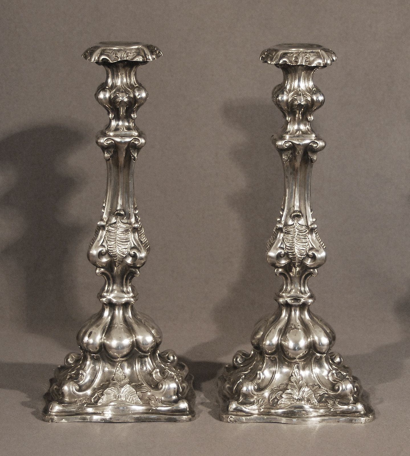 srebro, stopy kwadratowe, wysoko wysklepione, puklowane, trzony tralkowe, zakończone wazonowymi tulejkami, wydatne profitki; stopy, trzony i profitki dekorowane reliefowymi, fakturowanymi motywami liściastymi; wys. 31,5 cm, waga 628 g, srebro pr. 13, cechy probierni wiedeńskiej z 1865, monogram złotnika: AW. Stan zachowania: ślady dr. napraw przy krawędzi stopy.