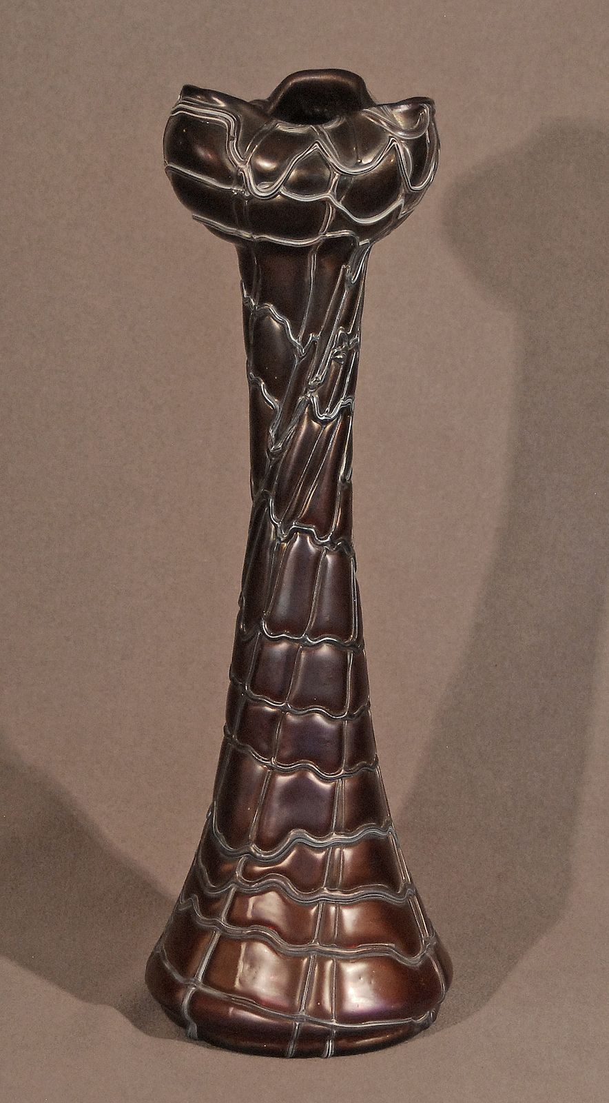 smukły, zwężający się ku górze korpus z półkulistym, trzykrotnie zgiętym do wewnątrz kołnierzem, powierzchnia opleciona nieregularną siatką biało-fioletowych nitek szklanych, forma wazonu nawiązuje do wzoru "Hyacinth" firmy Pallme-Kőnig & Habel. Stan zachowania bardzo dobry.