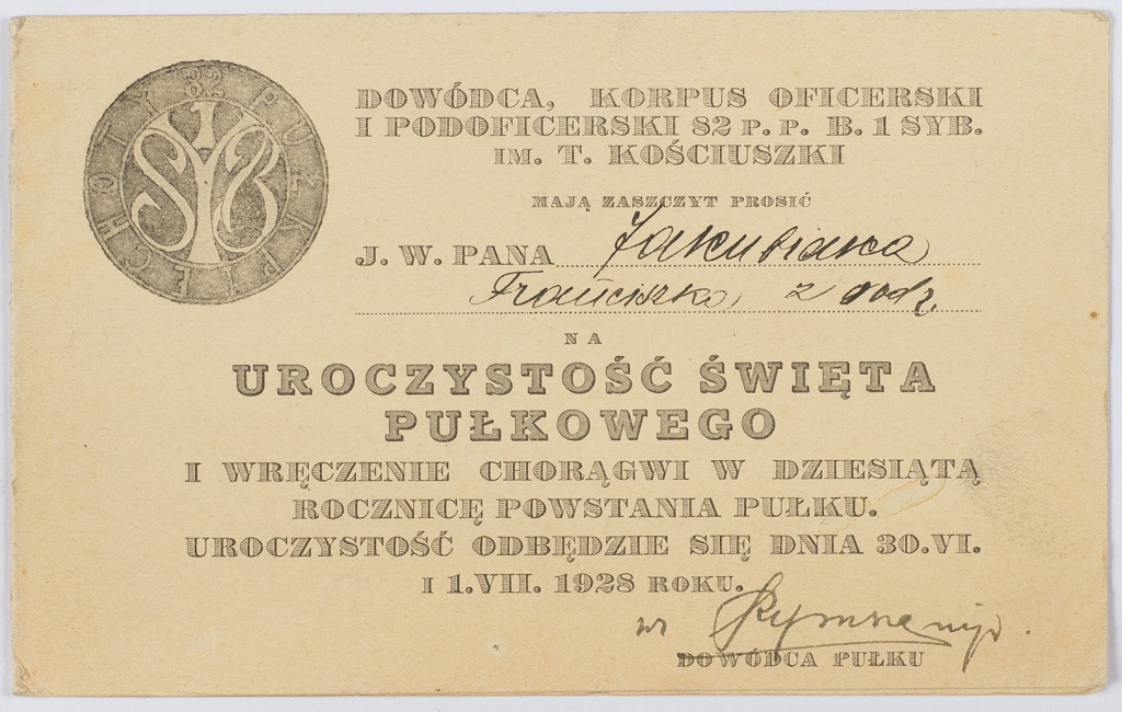 Zaproszenie na uroczystość Święta Pułkowego 82 Pułku Piechoty, 11 x 17,5 cm (złożone). Wystawione na nazwisko Jakubiak Franciszek wraz z rodziną. Stan bardzo dobry.