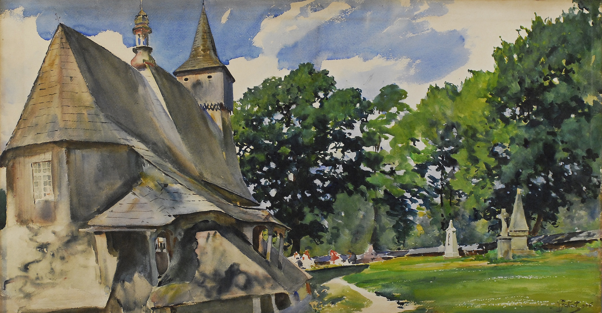 akwarela, gwasz, kredka, papier naklejony na płótno, 54 x 100 cm, 1906 sygn. p. d.: J. Fałat 906 Na odwrocie owalna pieczęć z napisem: Musée Jasieński / Cracovie / Autriche; ołówkiem g.f. (?). Obraz został zakupiony przez ojca obecnych właścicieli w Krakowie w latach okupacji.