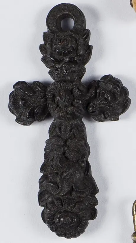 Krzyżyk żałobny z dekoracją kwiatową, wym. 65 x 34 mm, wykonany w ebonicie albo wulkanicie, noszony po 1863 r. Stan bardzo dobry.