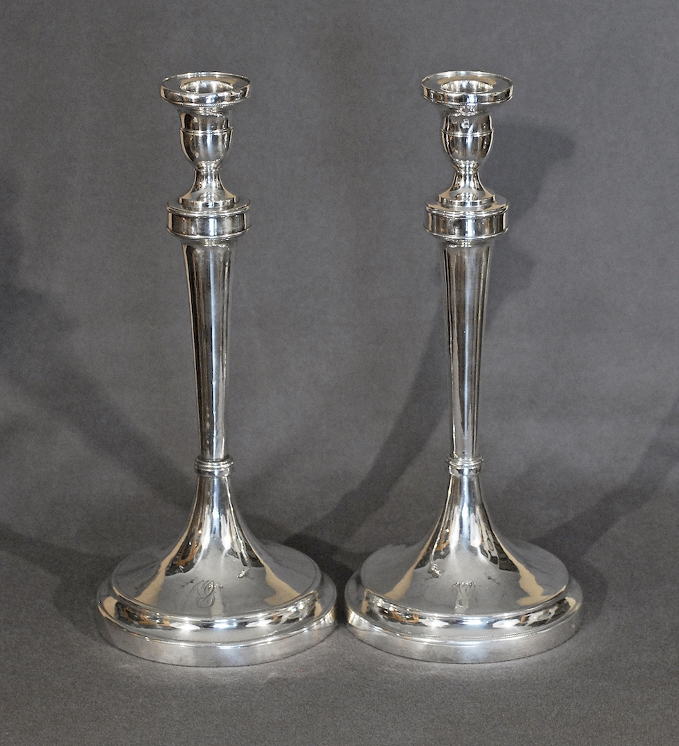 srebro, koliste wysklepione stopy, zwężające się ku dołowi gładkie trzony, wazonowe tulejki z profitkami w formie talerzyków, na stopach grawerowany wiązany monogram: VG;