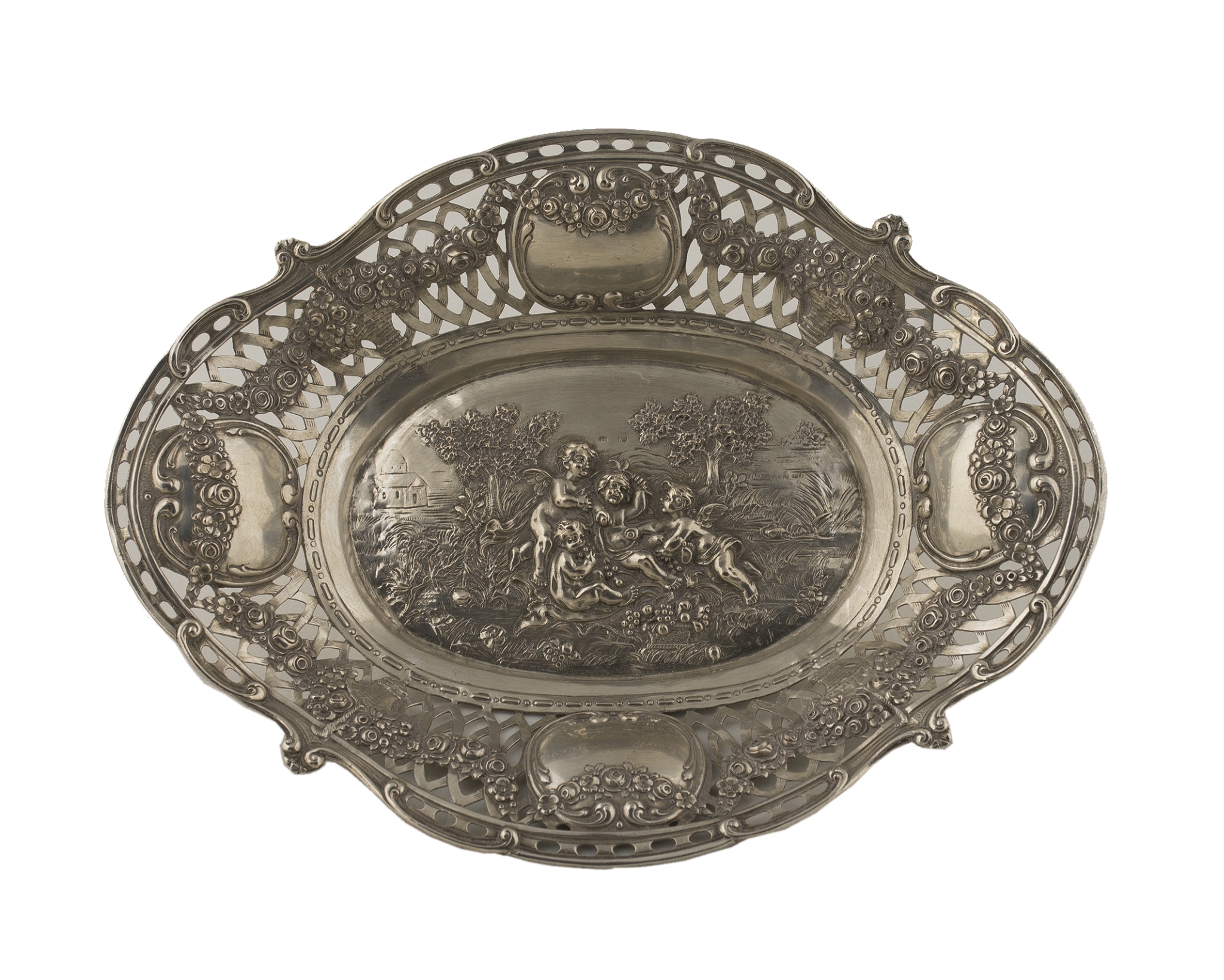 owalny, srebro próba 800, waga 304 g, wys. 4,5 cm, szer. 27,5 cm, głębokość 20,6 cm, Niemcy XIX/XX w.,