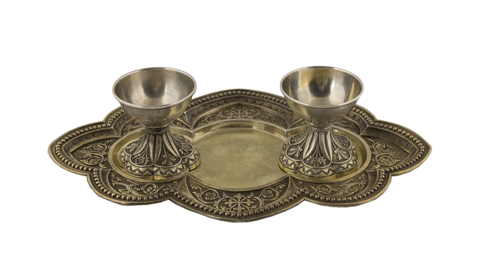 wydłużona, ośmiolistna, zdobiona wokół krawędzi pasem perełek, czterolistne gładkie lustro otoczone reliefową dekoracją z motywem krzyży, akantowej wici, smoków, palmet etc. Para ampułek do wody i wina w formie kielichów o sześciolistnych stopach, zdobionych stylizacjami roślinno-geometrycznymi, z gładkimi, wewnątrz złoconymi czaszami – osadzona w lustrze cylindrycznych trzpieniach.