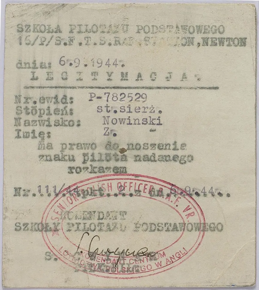 Szkoła Pilotażu Podstawowego - legitymacja uprawniająca do noszenia znaku pilota, na nazwisko st. sierż. Z. Nowinski, pieczęć tuszowa, podpis Komendanta Szkoły Pilotażu Podstawowego. Stan dobry.