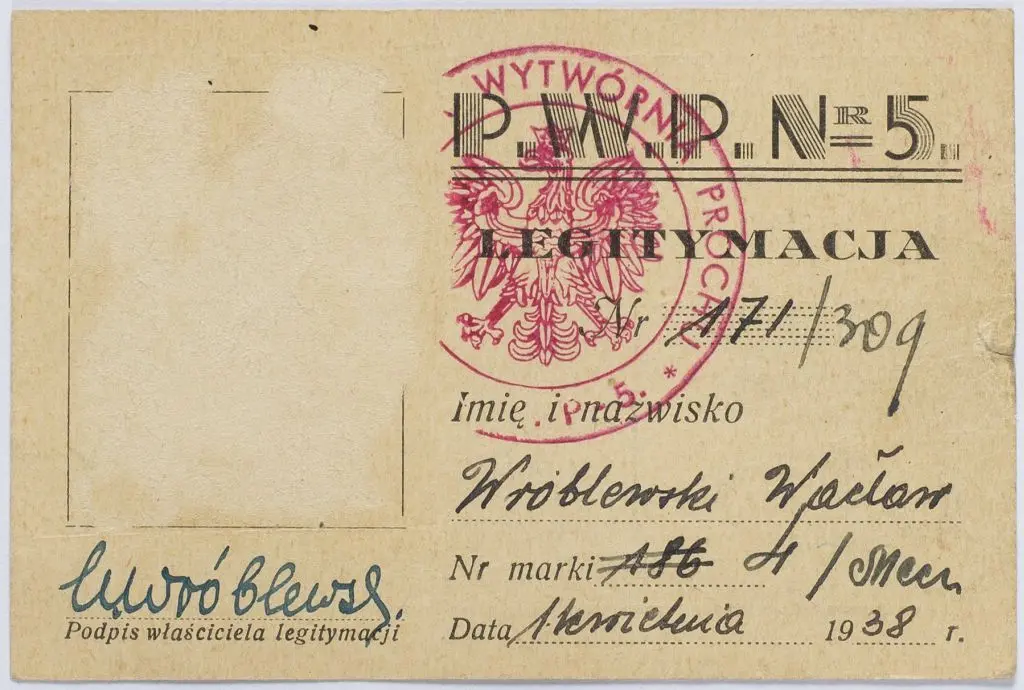 Legitymacja P.W.P. nr 5, na nazwisko Wróblewski Wacław, data 1 kwietnia 1938 r. ważna na lata 1938-39, brak zdjęcia, pieczęć tuszowa. Stan dobry.