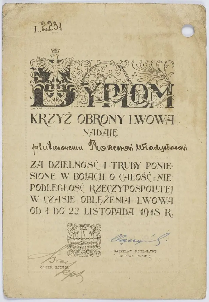 Dyplom nadający Krzyż Obrony Lwowa, plutonowemu Phoreszowi Władysławowi za dzielność i trudy poniesione w bojach o całość i niepodległość Rzeczypospolitej w czasie oblężenia Lwowa od 1 do 22 listopada 1918 r. podpisy. Naczelnego komendanta W.P. we Lwowie oraz oficera sztabu. Stan dobry.