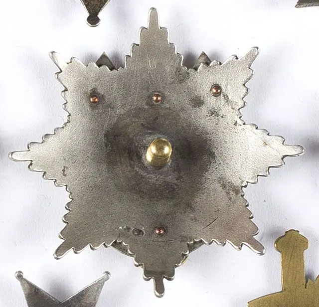 Odznaka 13 Pułk Ułanów Wołyńskich - srebro, emalia, 50 x 50 mm, rewers gładki, nity mocujące, próba srebra, słupek, nakrętka sygn. J. Knedler Warszawa Nowy Świat 45. Stan b. dobry.