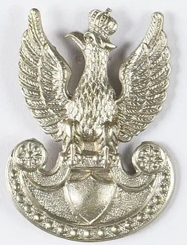 Orzełek wyprodukowany w Wielkiej Brytanii - 40,5 x 29,3 mm, biały metal, bity z kontrą, mocowany na omegi. Stan b. dobry. Kolekcja Ireneusza Banaszkiewicza.