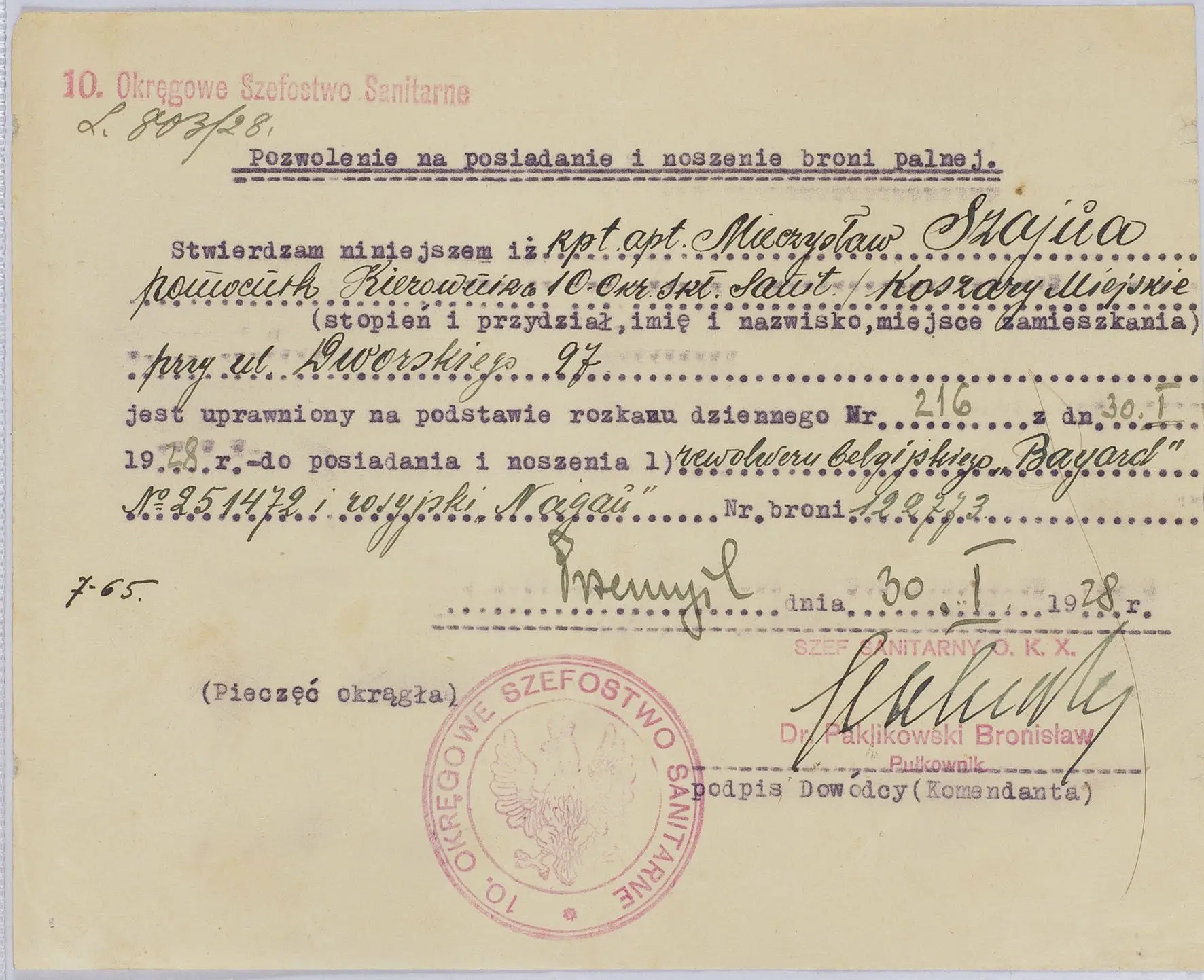 Pozwolenia na posiadanie i noszenie broni palnej na nazwisko Mieczysław Szajna - Przemyśl, 30 I 1928 r., pieczęć tuszowa. Stan dobry: lekkie zagięcia papieru.